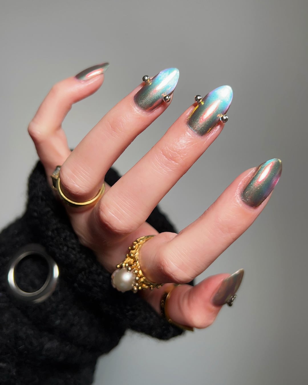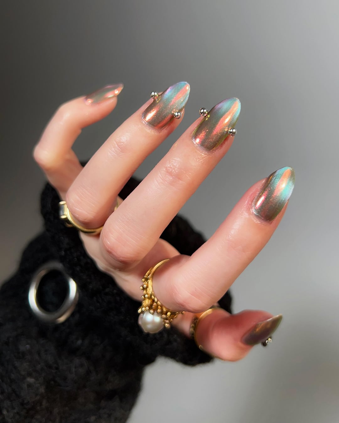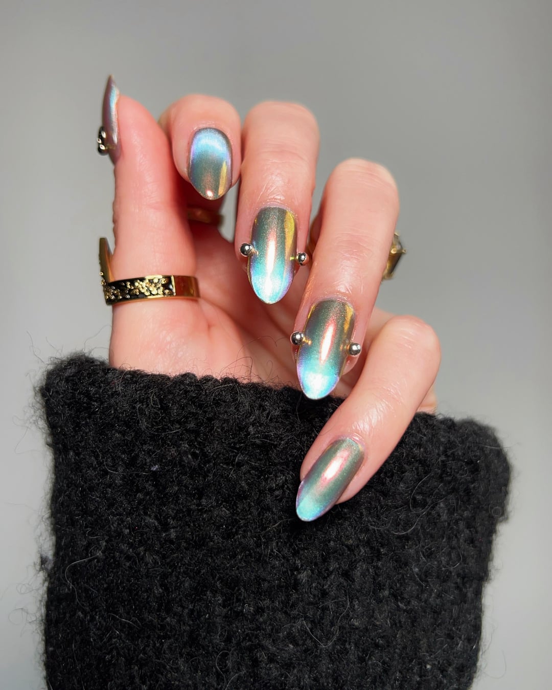 🤯🔥 WOW!!! They look amazing! I think you absolutely mastered the chrome powder. The smooth glass surface really makes the colors light up. And those piercings…such an AWESOME touch! What do you find difficult in using chrome powders with regular polish?