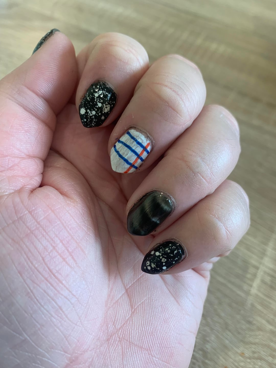 Accent nails: Sally Hansen Graphite Gravity, unbranded nail art pens in white, red, and blue