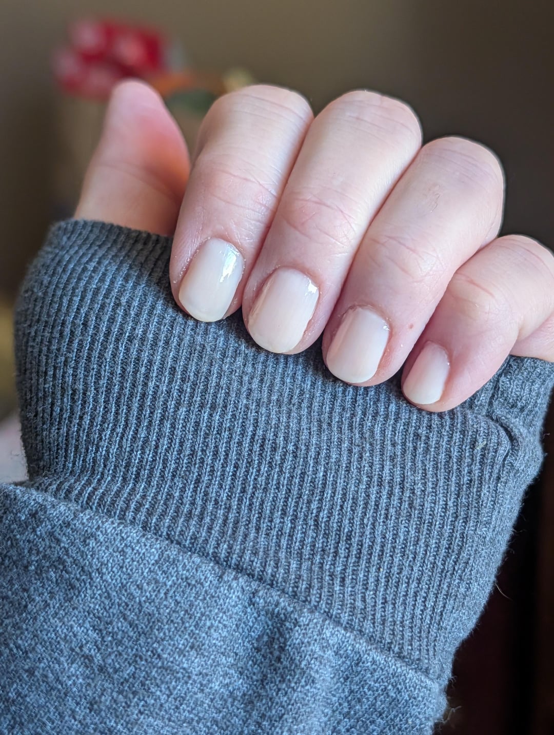 I've never seen a product with no brand before, but here we are. "Strong Nail Concealer" in "sheer" from Walmart. This was less than $3.00 and I think it looks as pretty as the beloved Kur Illuminating Nail Concealer (which I also have). And no streaks. I can't speak to the durability yet, but so far I love it. This is 3 coats with a coat of Essie Gel Couture top coat.