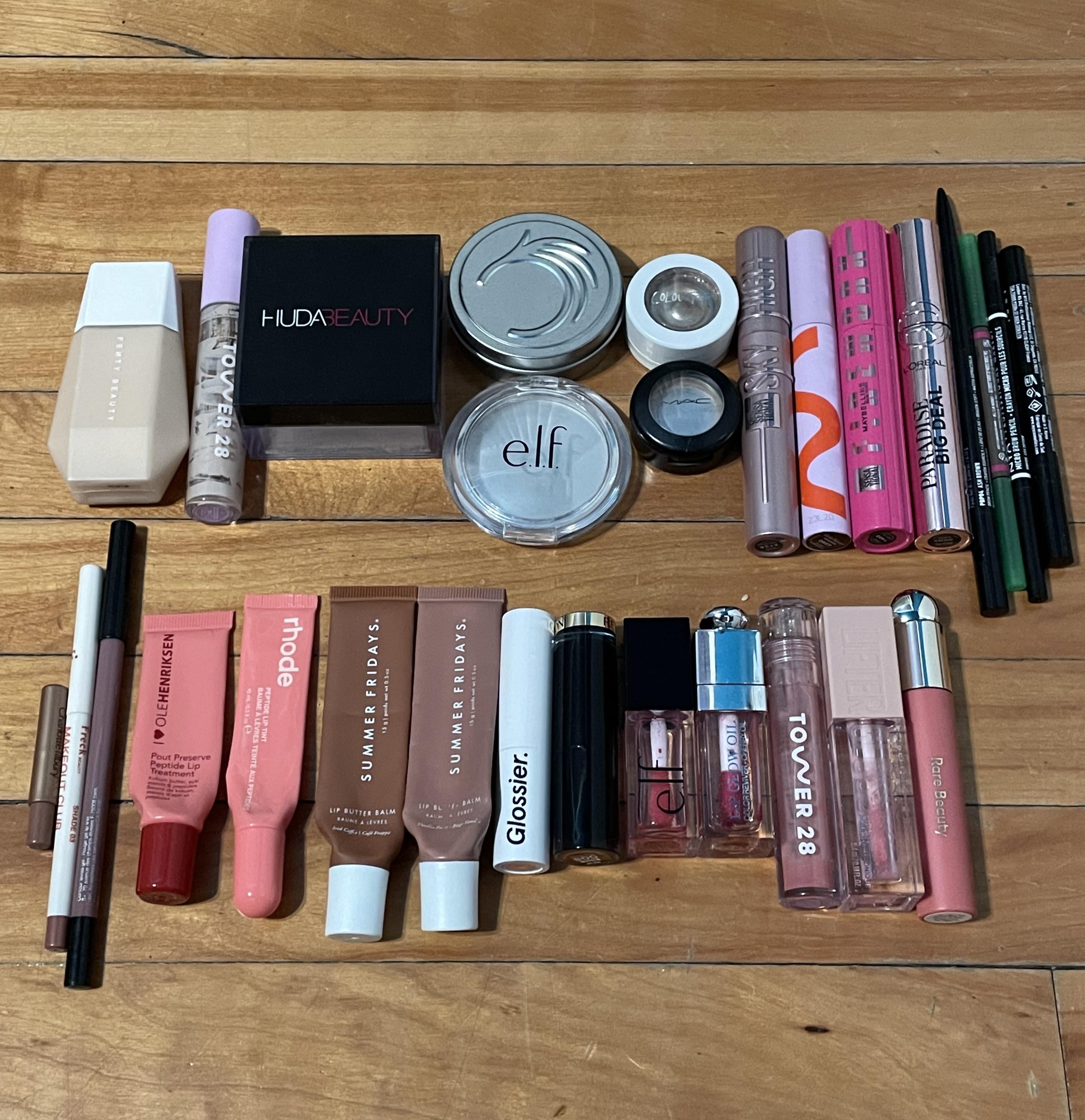 Fenty skin tint, Tower 28 concealer, Huda Beauty loose setting powder, elf pressed powder, Cheekbone beauty pressed powder, MAC eyeshadow in Omega, Colourpop eyeshadow in Ritz, L’Oreal Sky High mascara, Tower 28 mascara, Maybelline Firework mascara, L’Oreal Lash Paradise mascara, NYX brow pens and pencils, Charlotte Tilbury Iconic nude lip liner, Freckles Beauty 03 lip liner, Sephora Collection Sink or Suede lip liner, Ole Henriksen Strawberry Sorbet lip balm, Rhode Peach Pit lip peptide, Summer Fridays Iced Coffee & Vanilla Beige lip balms, Glossier Cake Gen G lipstick, Revlon Run Raisin super lustrous lipstick, Elf Red Delicious gloss, Dior Mahogany gloss, Tower 28 pistachio gloss, Maybelline Gummy Bear lifter gloss, Rare Beauty Hope lip stain.