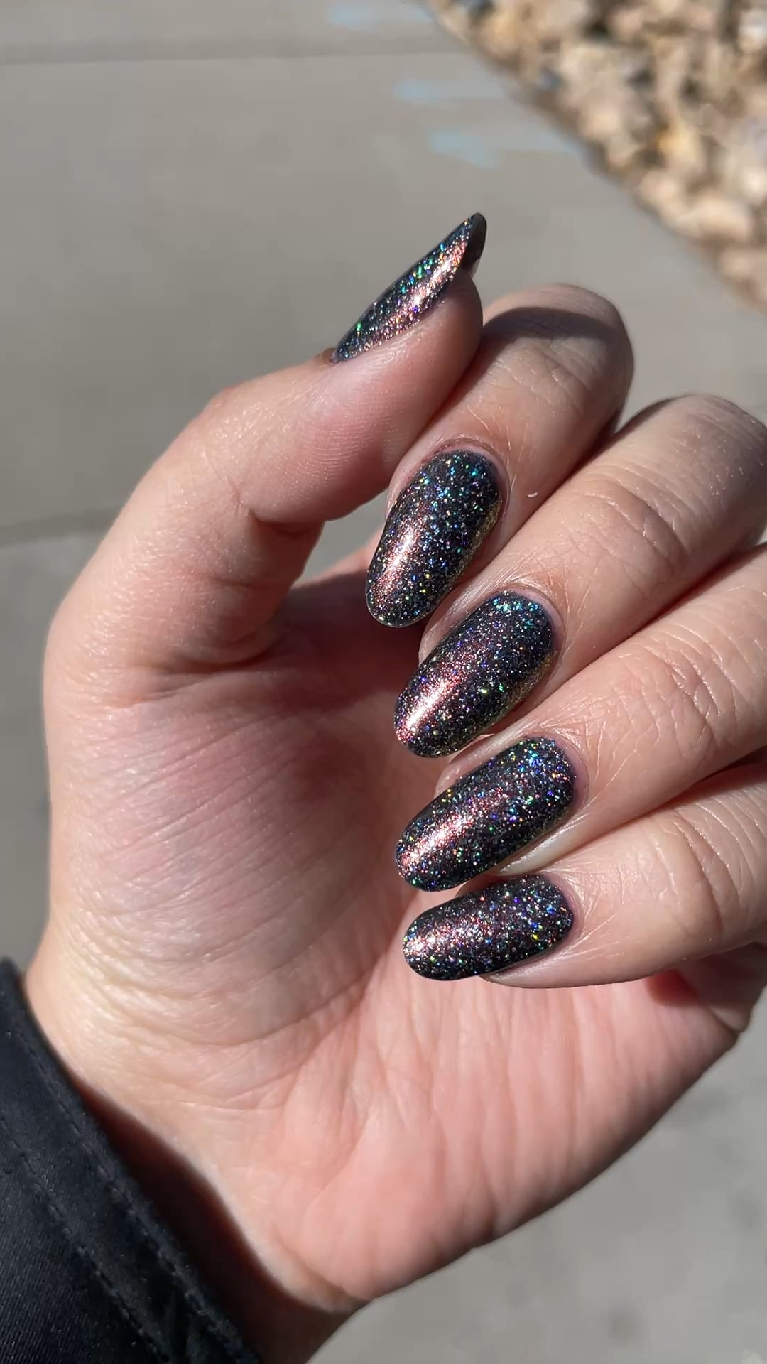 products used: opi nature strong base coat, holo taco existential crisis + flakie holo taco, essie gel couture top coat