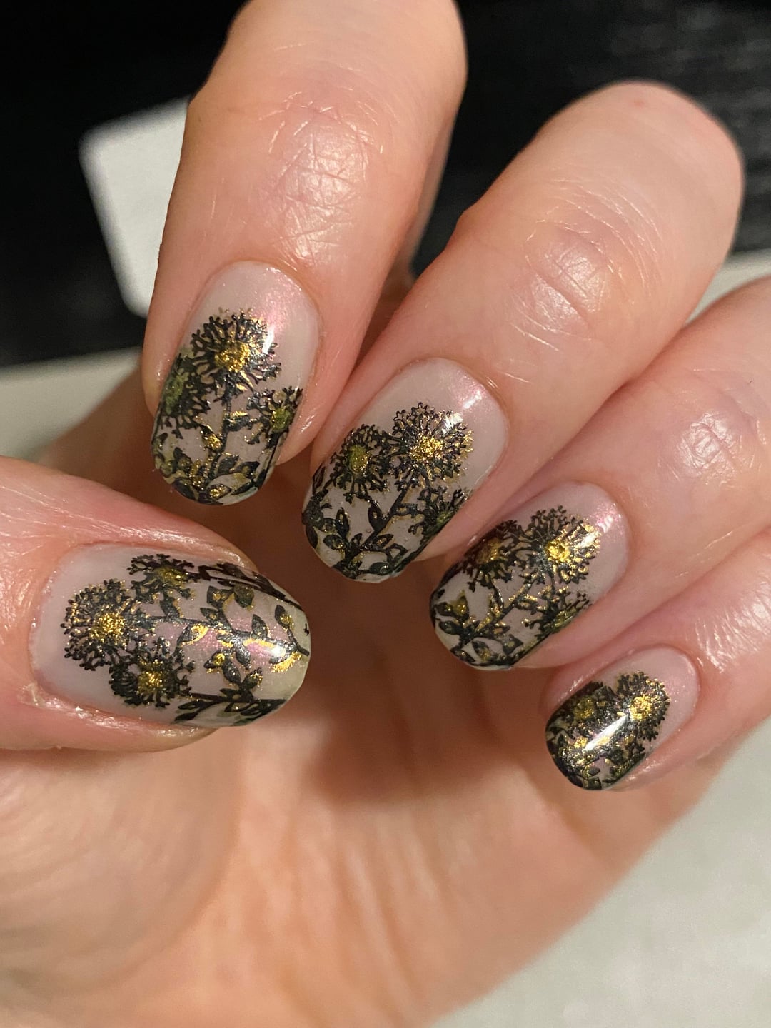 Products used: Nails Inc – Got Me Glowing – base colour MoYou London – T-Rex – gold stamping polish Franken Polish – black stamping polish mixed with silver stamping polish – Graphite MoYou London – Top Coat Sally Hansen – Insta-Dri Top Coat KADS – Flower 063 stamping plate by xJustanothergalx
