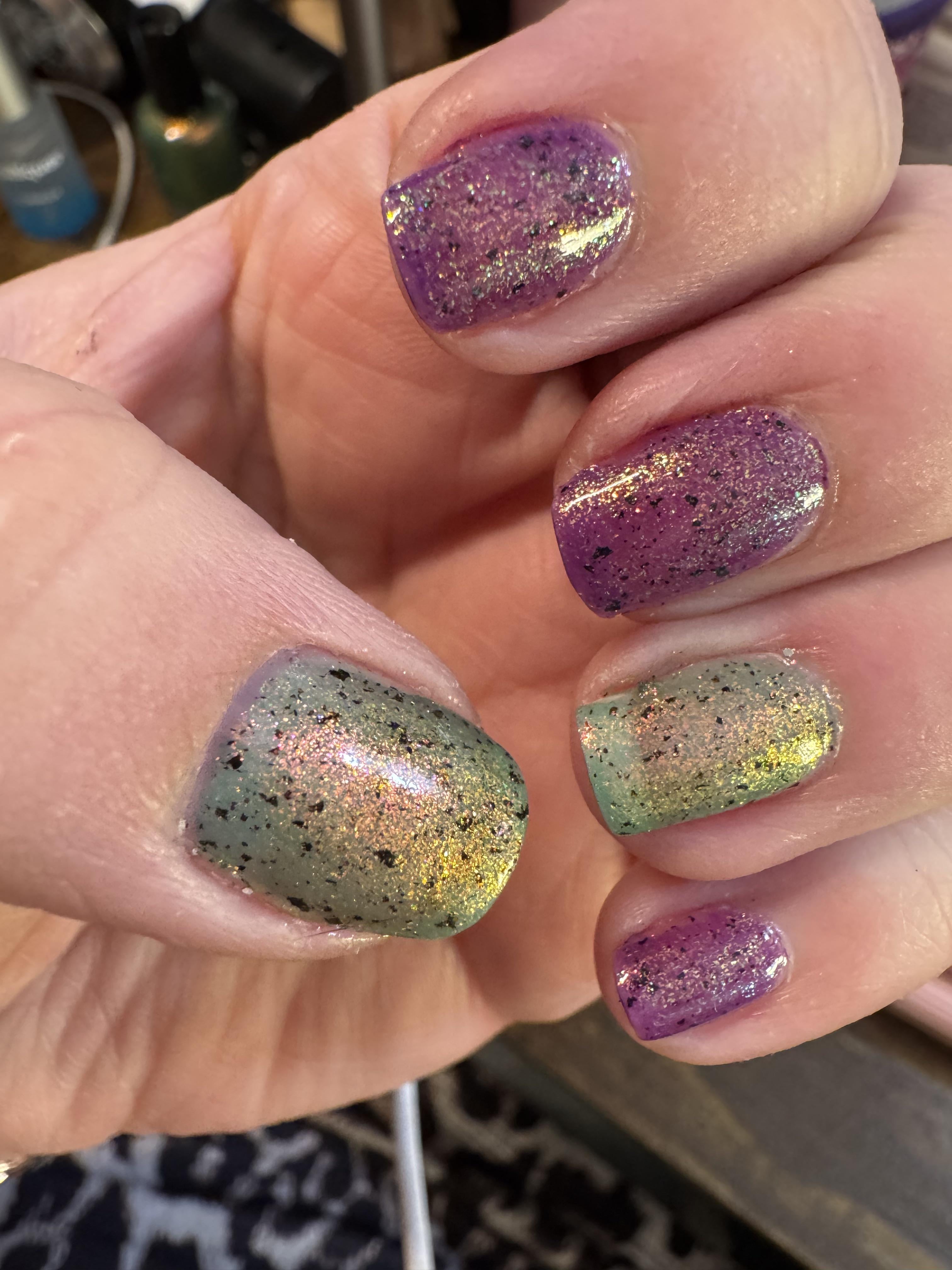Base and top coat nailtiques formula 2, layer of glisten and glow ridge filler, 3 coats color – green glisten and glow Friends and Family – purple glisten and glow rocking out at rainbow cone