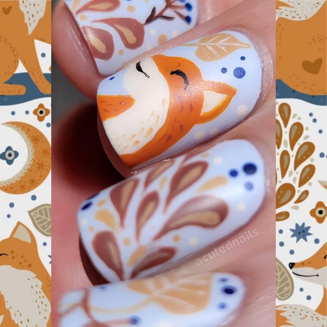 Sometimes I need an artistic palette cleanser of something not in my usual wheelhouse. One of my fave sources of inspo to find that is in fabric designs. This pattern is of a whimsical adorable fox surrounded by some winter floral that are not my normal filler, but I love his little face so I knew I had to try it. A lot of it was trust the process, and figuring out framing and layout is still something I'm working on, but I'm super super super happy with how these came out. Even though you know I'm a glossy guy through and through, I think the matte top coat was also a winning choice for me, helps those details pop!