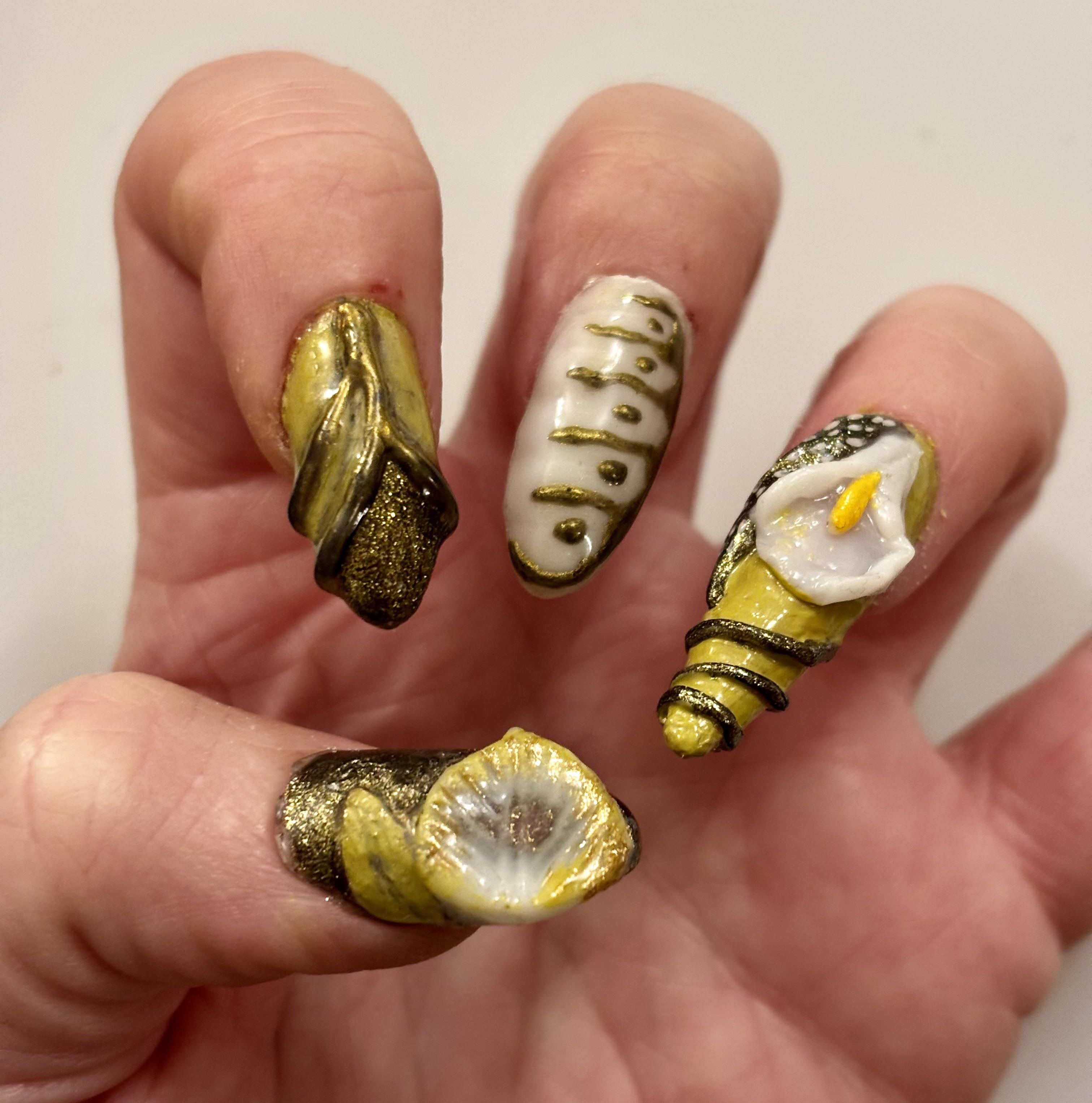 I’m trying to teach myself to do gel nails – I recently ordered a pot of sculpting gel so I’ve tried some 3D nail art. These kind of turned into a botanic theme, and I’m really pleased with them. I don’t have any gel polish so these are done with ordinary polish