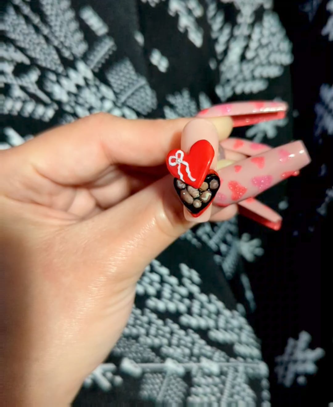 I'm quite excited about how my little heart shaped box of chocolates turned out.🤩 Handmade with solid builder gel, gel polish& one little flatback pearl bead.😊💅🏼 by shrrreddit