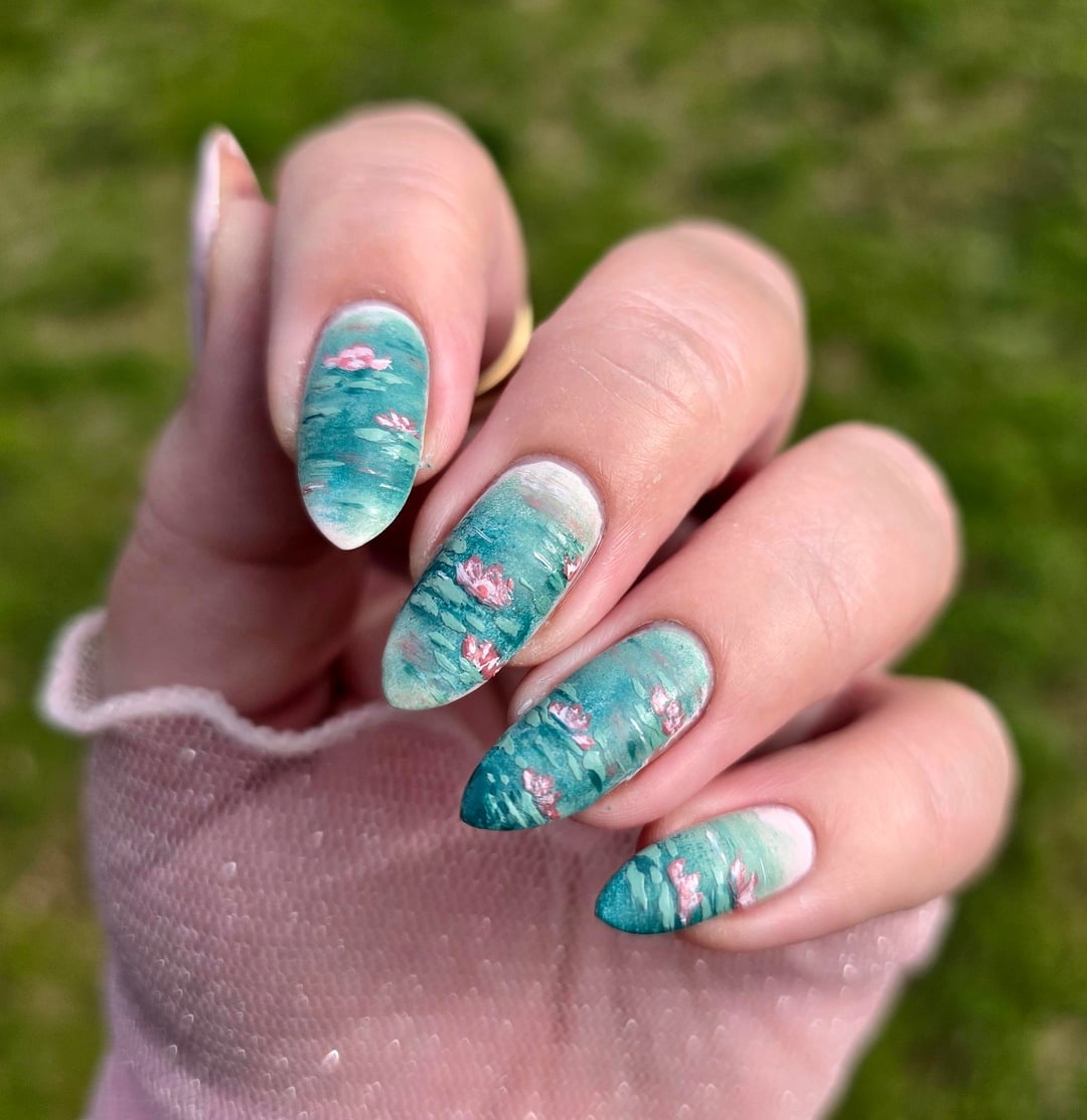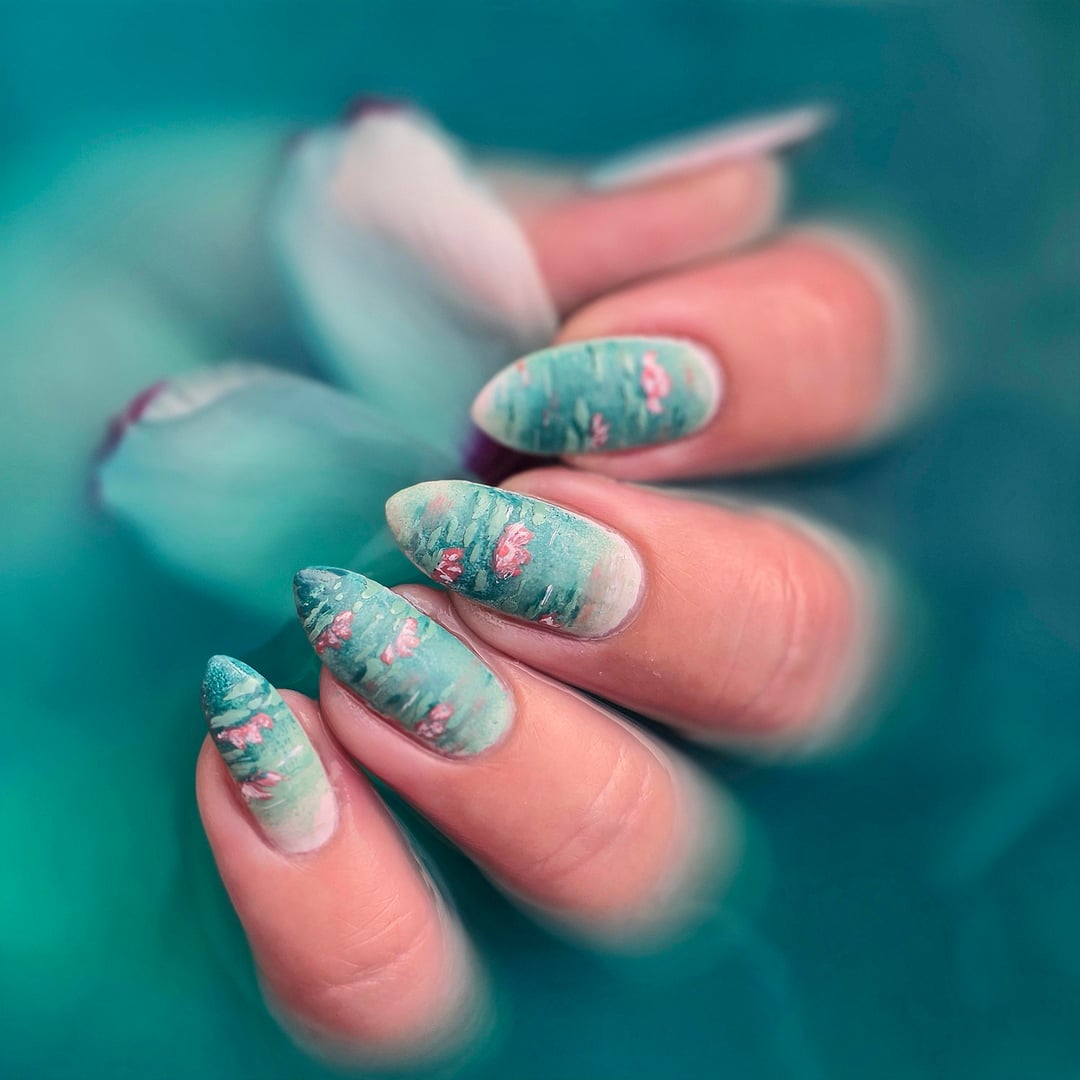 Fleur was used as the base on all nails, with a sponge gradient of Just Because and Secret Garden, finished with a matte top coat. I added vertical brush strokes using Blossom and Just Because to mimic water movement and Secret Garden for lily pads.