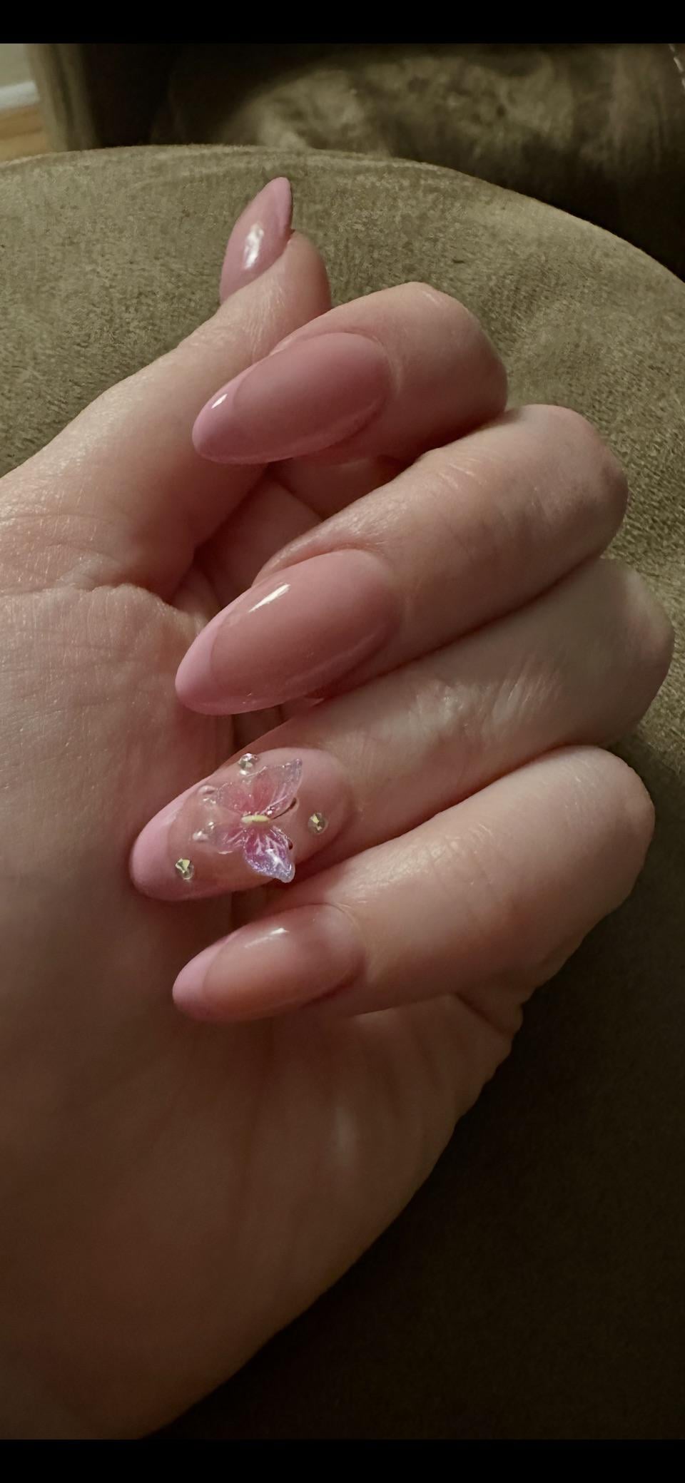 Acrylic overlay on my natural nails. Did pink French w the cutest butterfly charms 😍 by Physical-Marketing49