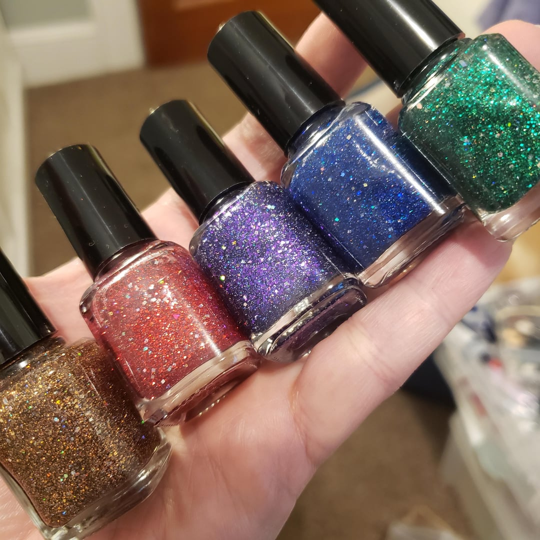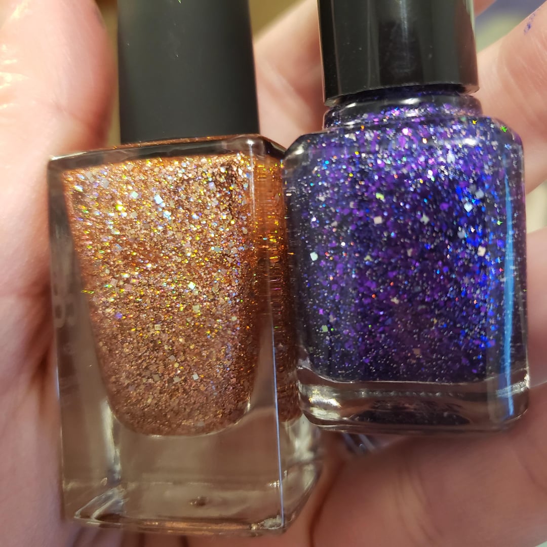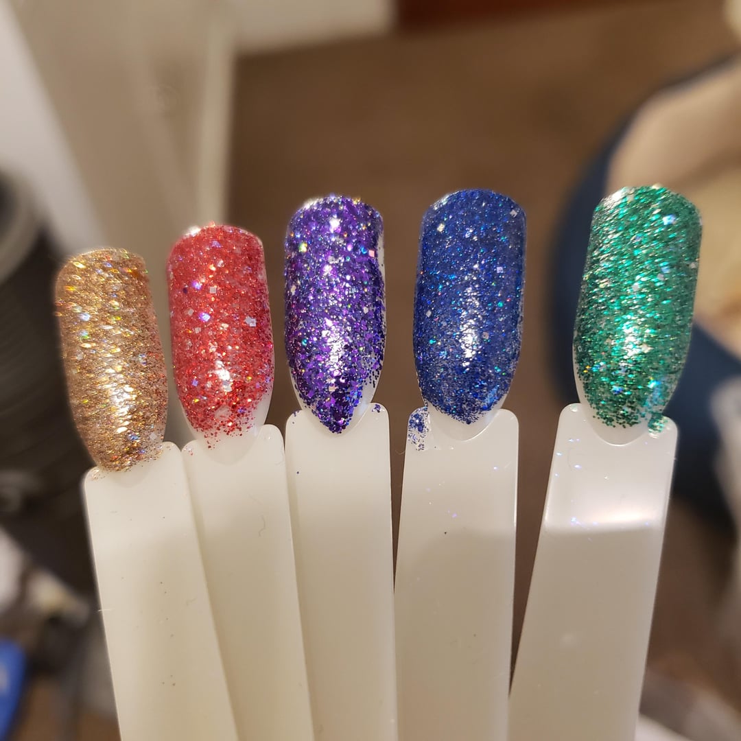 Glitter Unique glitter suspension base, 2-3 sizes of color glitter (0.004 and 0.008 mainly, with a little 0.015), two sizes of holo glitter (0.002 and 0.004) and 0.025 holo square glitters. Mix is a bit different for some as I didn’t have all those sizes of all colors. The bronze is a mix of ā€œbronzeā€, ā€œcaramelā€, and ā€œcopperā€ glitters.
