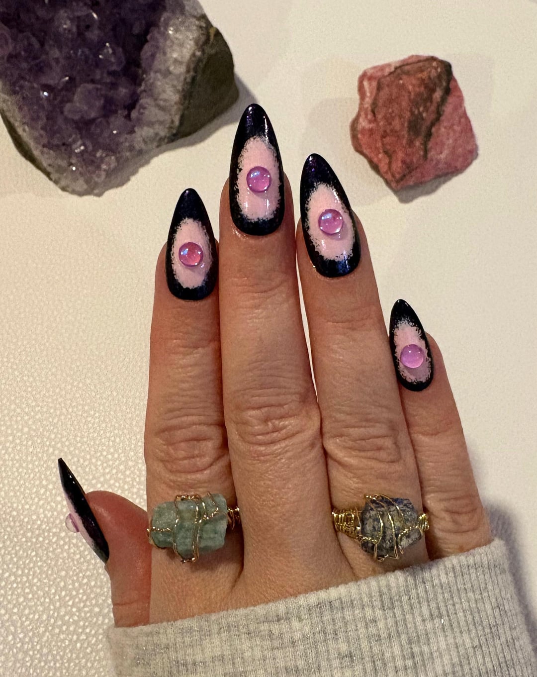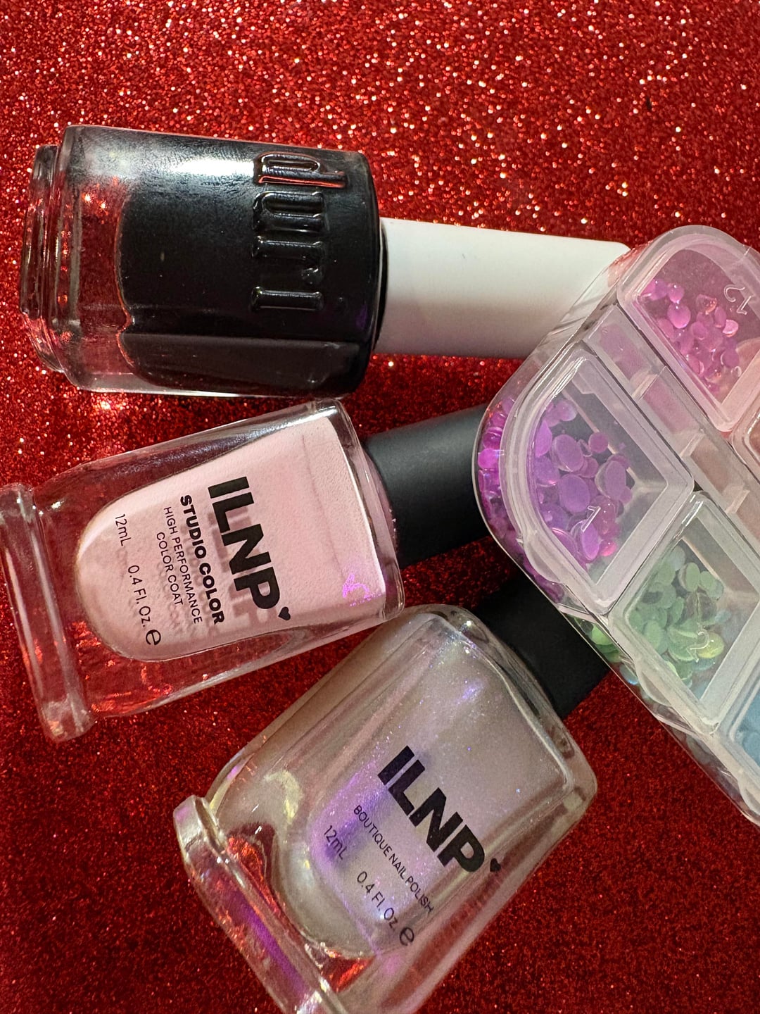 First I started with 2 coats of ILNP Twirl, then I took a sponge and dabbed on Duri Black Caviar around the edges, after that I applied ILNP Moonstone, then I applied Duri Miracote top coat and pressed the pink bubble beads into each nail. Thanks for looking! 🩷