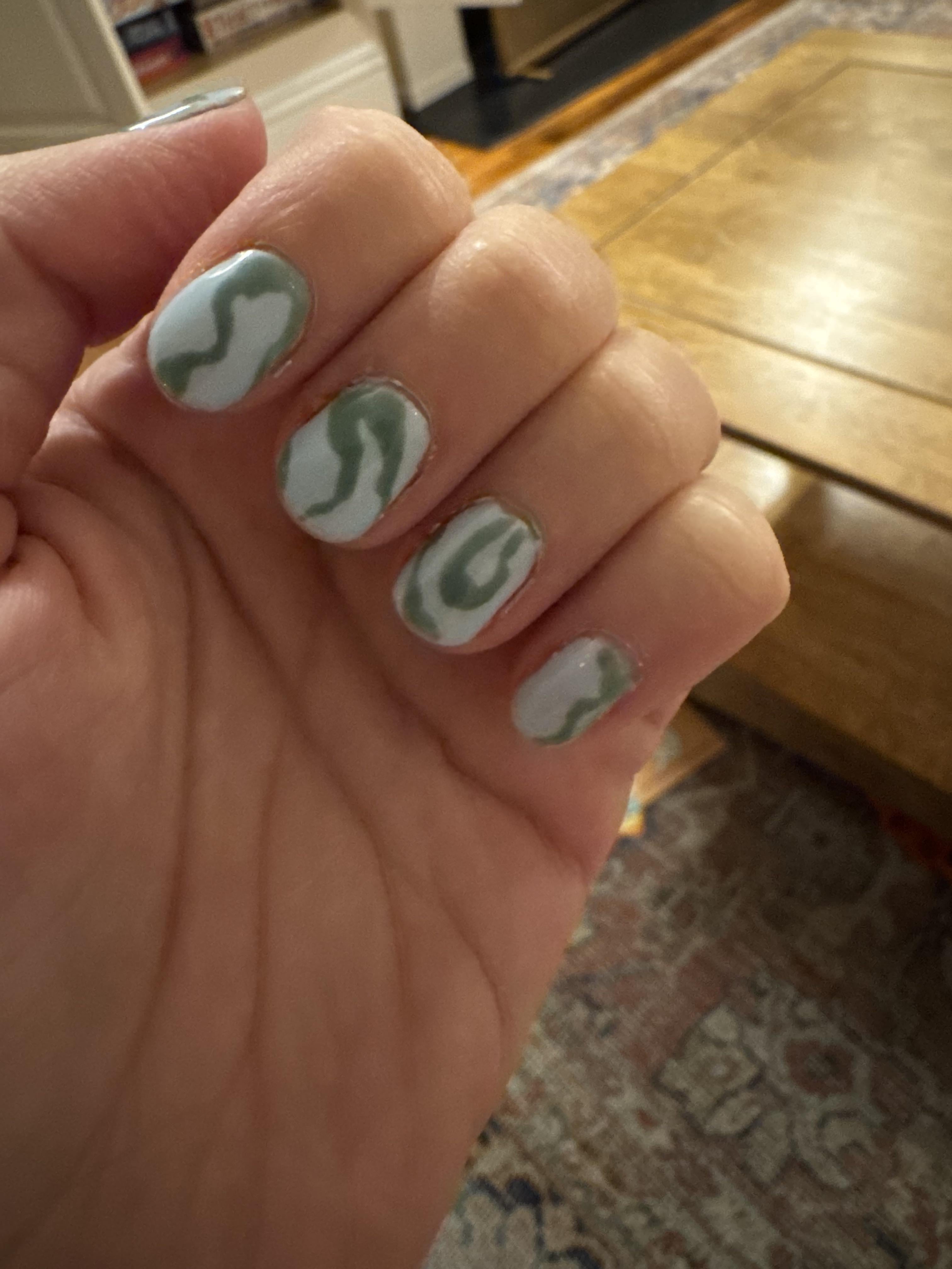Hello! I’m new to nail art but consider myself a decent artist in other mediums. I’m finding it impossible to get smooth, clean lines—as you can see, these are quite jaggedy. Even the edges of the light blue seem to become rough when I cure. I am using a Jodsone kit from amazon. Is it because I’m using cheap materials? Or is nail polish just a different beast and I need to practice more?