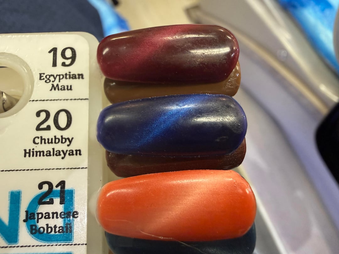 I had never tried cat eye before, so I figured I’d try it on my toenails since they don’t show all the time in public. The salon told me it cost $10 more, which I didn’t see a reason for, but I agreed to. I don’t see the cat eye effect, though. I Googled it just now, and the search results said that there should be magnets waved over the polish to manipulate the metal to achieve the desired effect. They never used magnets. I don’t see why I spent an extra $10; do you?