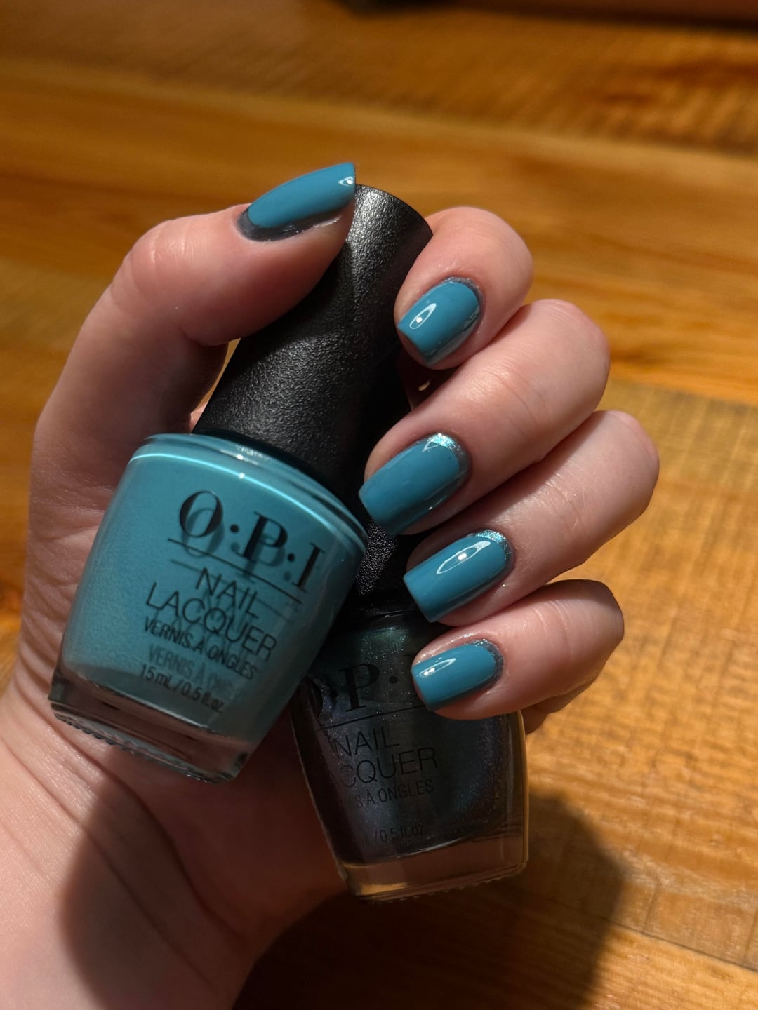 Having fun with this combo! OPI Can’t Find My Czechbook over OPI This Color’s Making Waves finished with Essie Gel Couture 00 top coat by burgersommelier