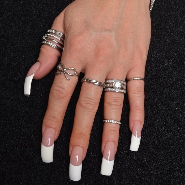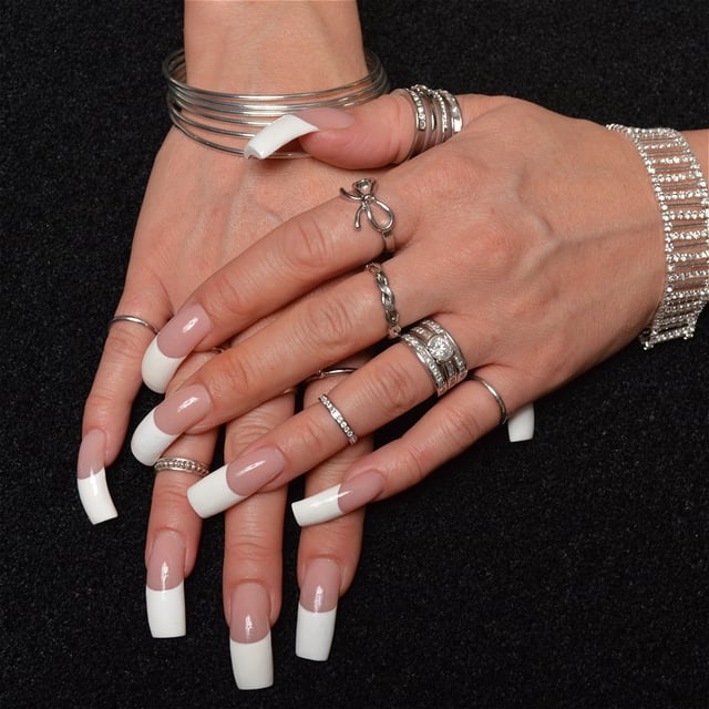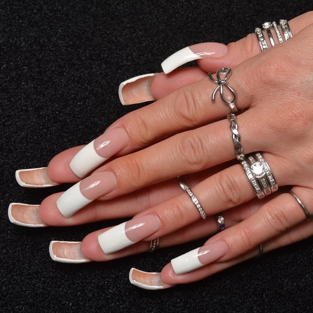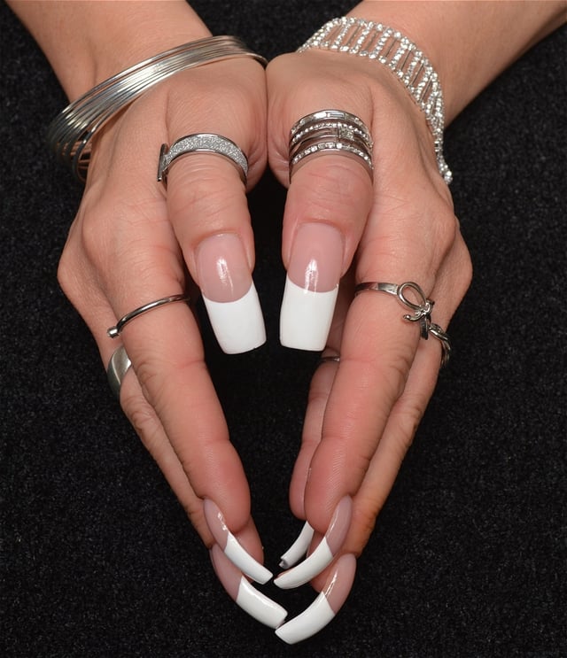 These are her nails professionally done in a classic French Manicure.