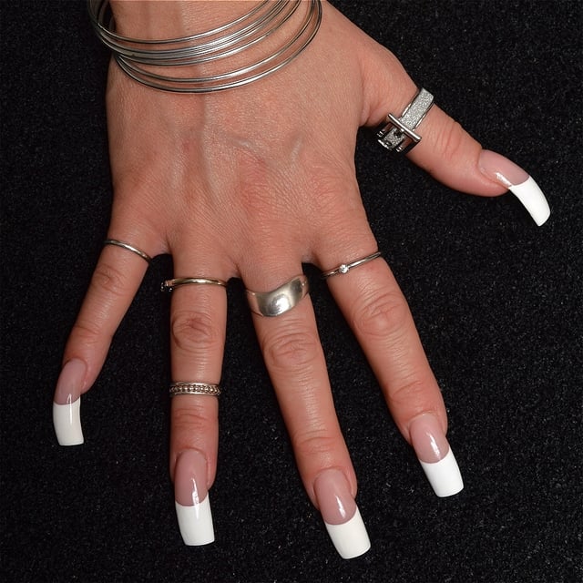 I love her jewelry but I’m really not a fan of these. The nude suits her well, but they’re too wide and don’t do her otherwise nice hands any favors. Also the curve downwards is far too exaggerated.