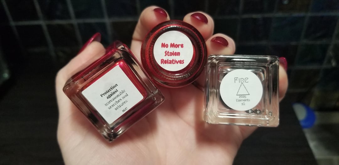 My anti Ice mani. Base: Kiss Impress. Polish: Lurid Protection Against Unreasonable Searches and Siezures, Waabooz No More Stolen Relatives. Top:Lumen Fire by Ohlookashinyy