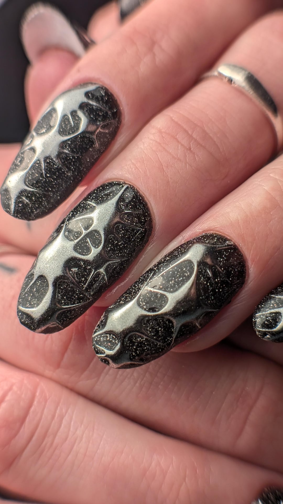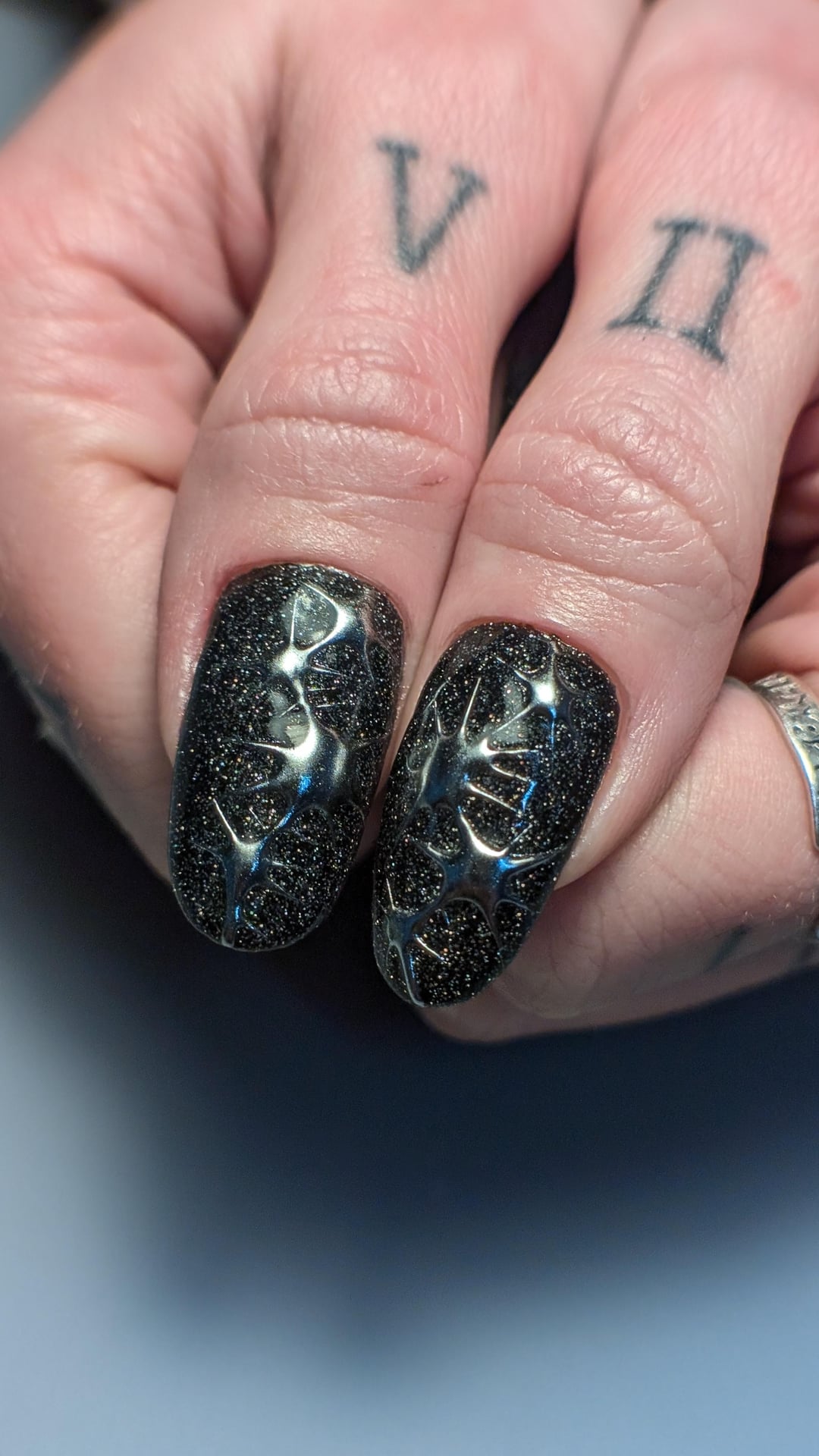 Did these for my bestie last week. The base polish is this amazing black with tiny silver and holographic glitter but I couldn't get the holo to show up no matter what lighting I used. They're still awesome though.
