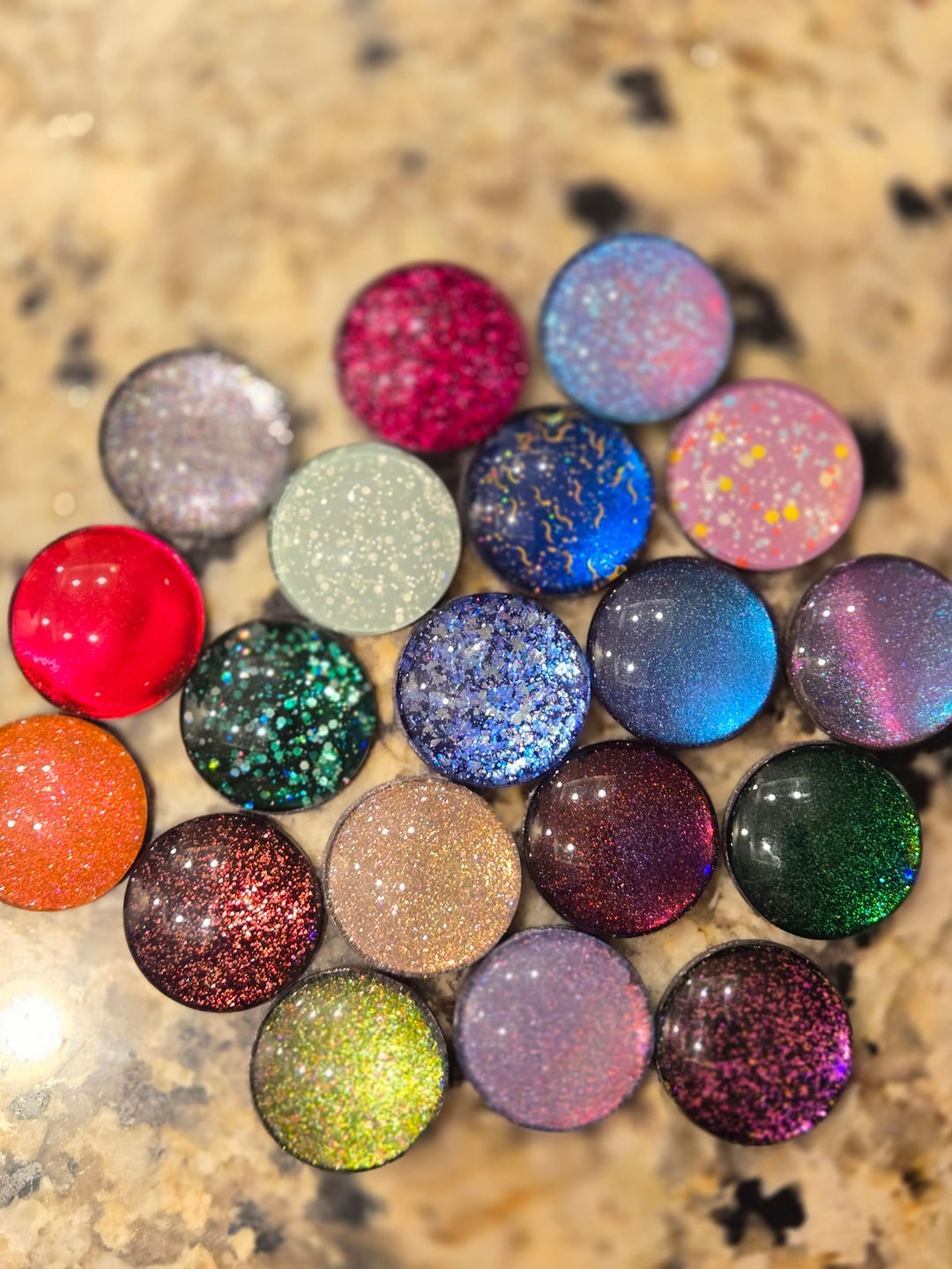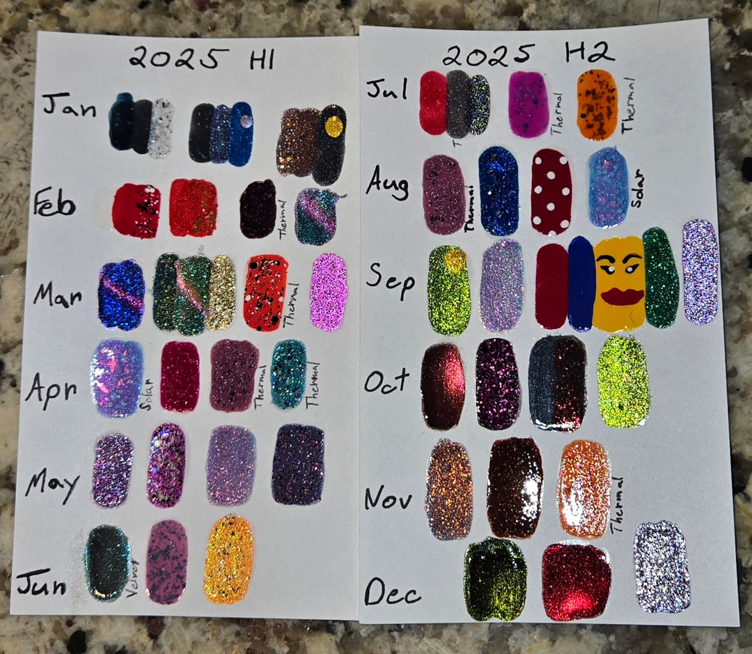 I'm keeping a promise to myself to document my 2025 polish adventure. It's not fancy and it's a little hard to see, but I did a little swatch on an index card for every new mani. Inset circles represent stamping art. Clearly I love sparkles, thermals (my toes are almost always thermal) and magnetics. I need to stop buying blues and white/nude shades that I don't wear. Polish stays on my nails almost too long, so I love painting cabochon magnets in the meantime. I included a few of my fave manis too.