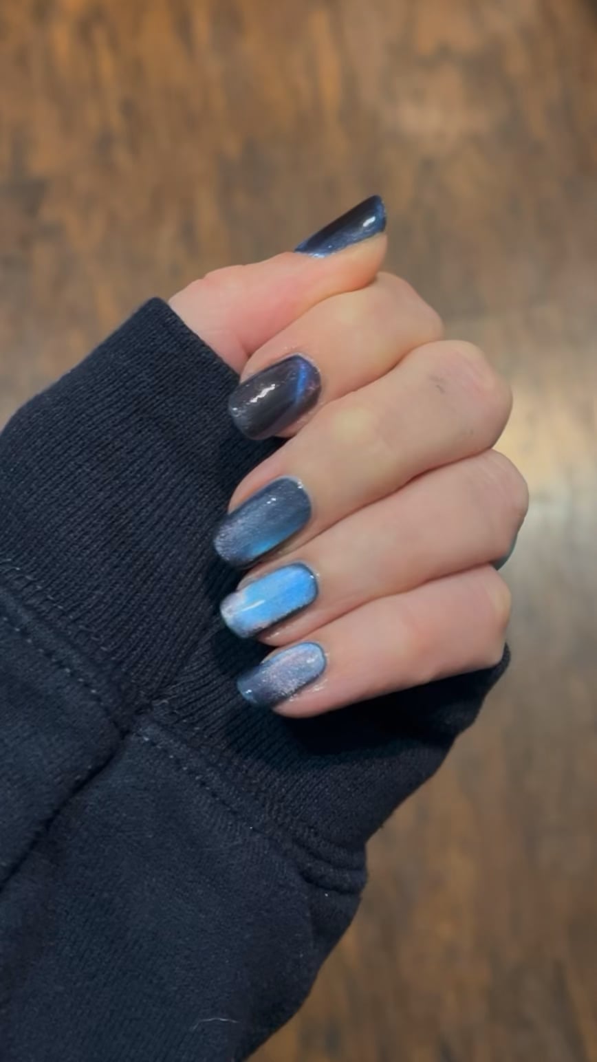 I’m excited to play with it over a variety of base colors since I’ve only done it over blue bases so far. Glass eye with the 5d spinner it reads deep navy jelly with mid blue shifty glitter. Cat-eye it goes glittery jelly maroon base with the mid blue magnetic stripe.