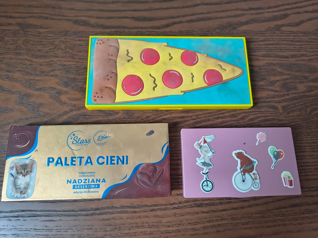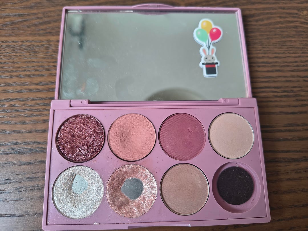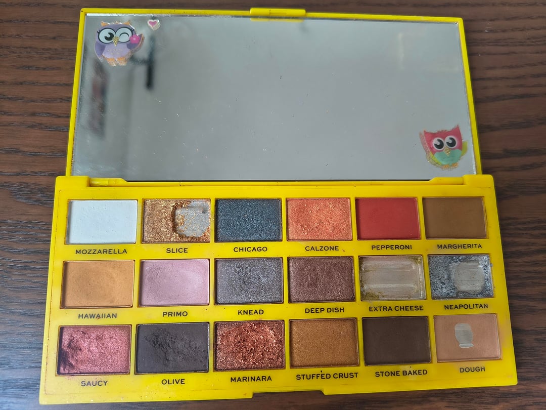 Hello! My first post here, presenting all of my eyeshadow pans. The Tasty Pizza palette is a gift from a friend who studied in Spain at the time. This is my oldest pallette (around 6 years old) and was my only one for a long time. I used some of the shade saucy for creating a lipgloss and it turned out great. Honestly i kind of grew out of these shades but it has such a value to me that I will continue to be creative with it or just keep it.