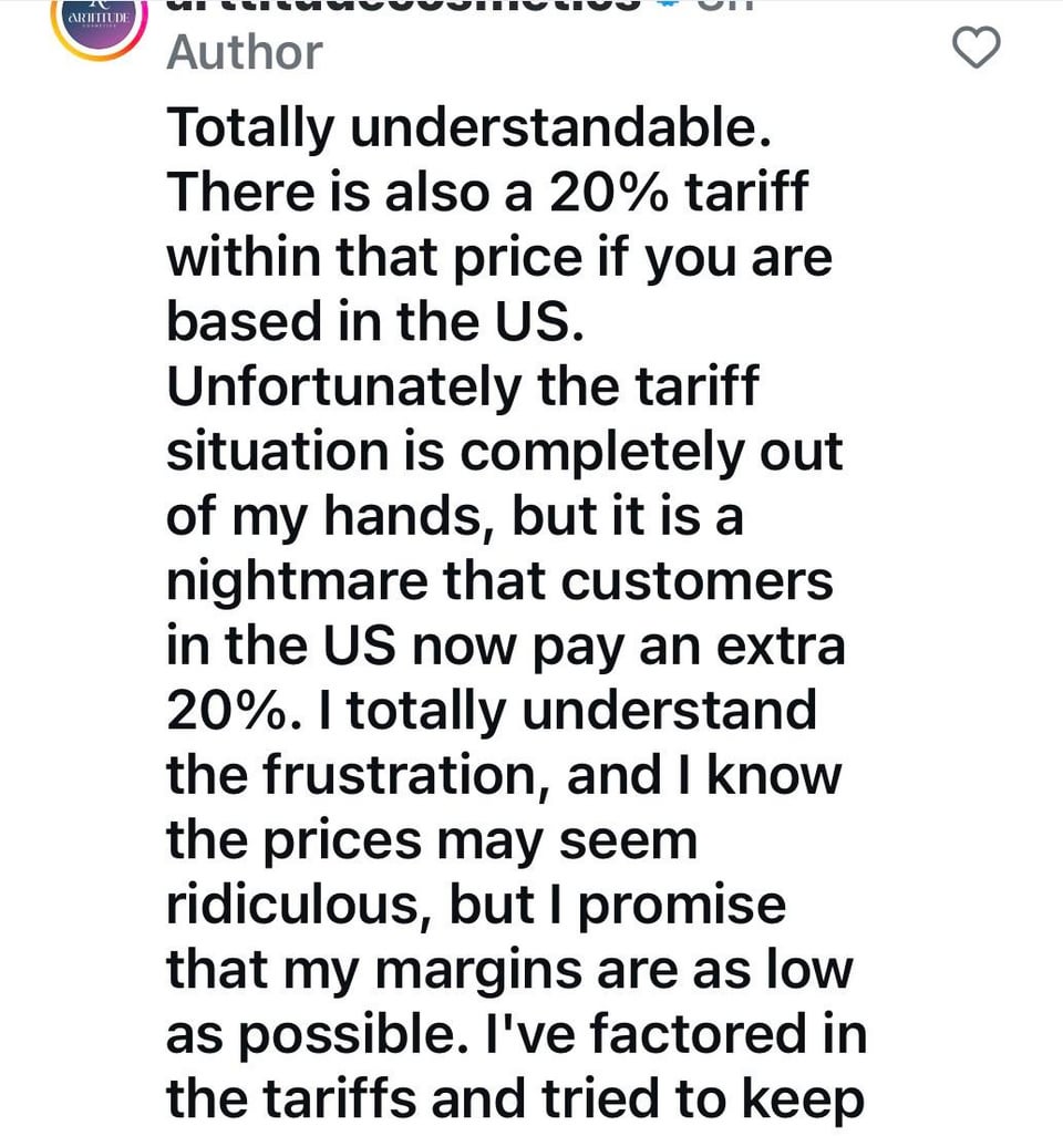 Edit: I appreciate that she includes the tariffs at checkout because otherwise, it arrives with a bill to pay the tariff plus a $25 brokerage fee, sometimes months after you got your package so you can’t refuse it. Some of those other brands are just mailing them and letting customers deal with it