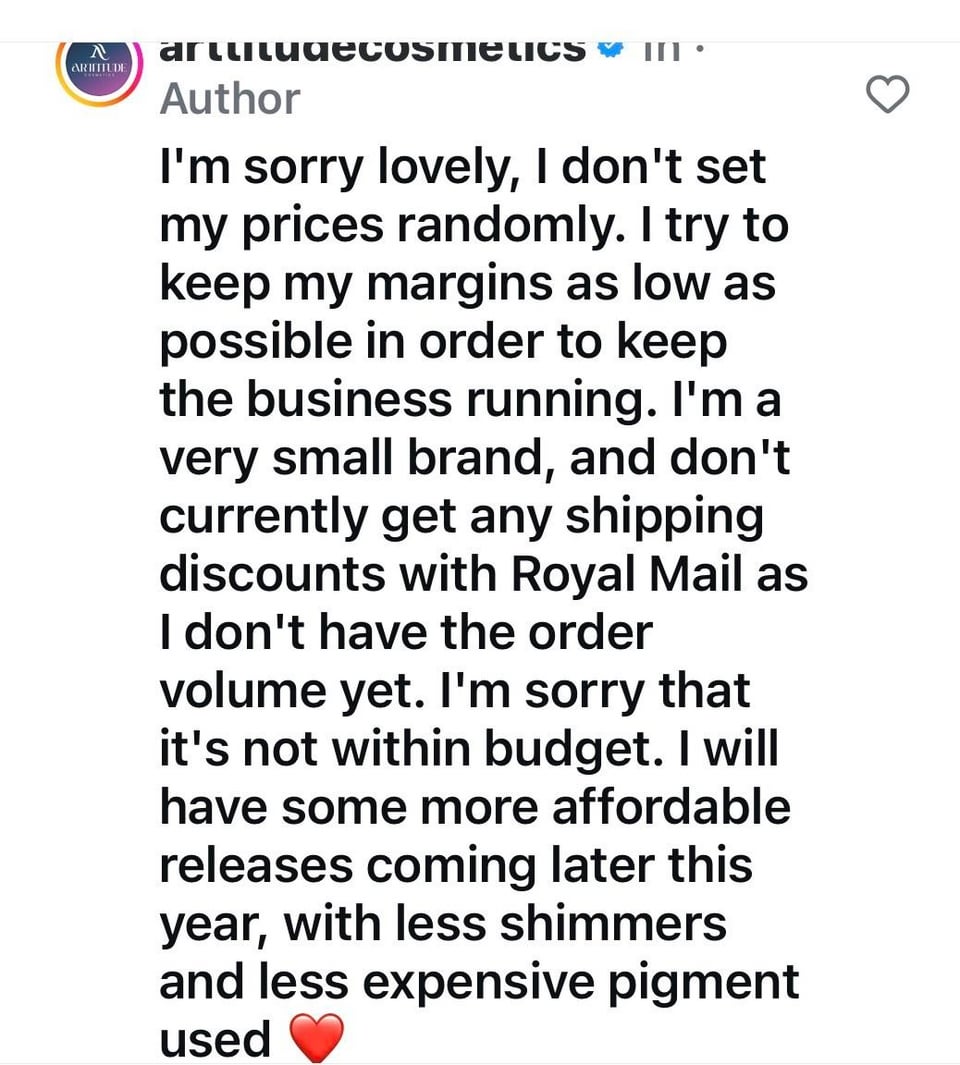 Artitude just launched a new palette, and for US customers it comes out to around $88 shipped. I understand small brands, tariffs, shipping costs, silver pigments, etc.—the owner explained all of that in the comments. I don’t think prices are set “randomly,” and I don’t think the brand owes anyone affordability.