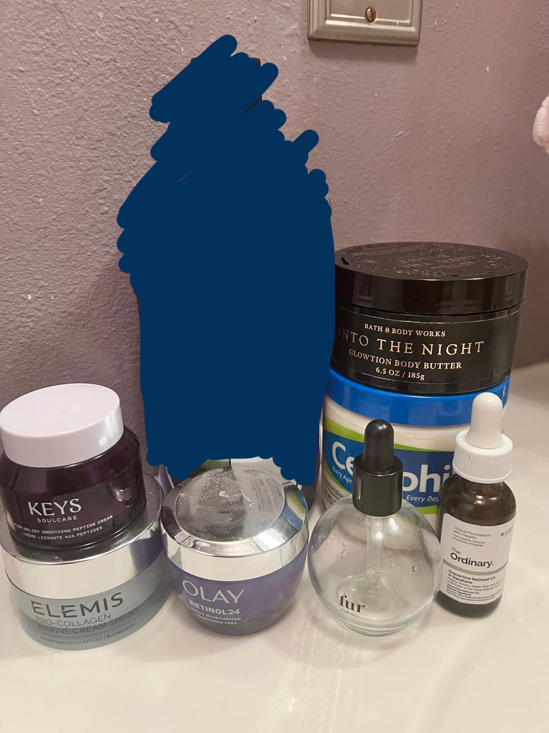 Products shown: Olay Retinol 24 The Ordinary Granactive Retinoid 2% in Squalane Keys Soulcare Firm Belief Smoothing Peptide Cream Bath & Body Works Into the Night Glowtion Fur Oil Elemis Pro-Collage Marine Cream SPF 30 by Jams0610