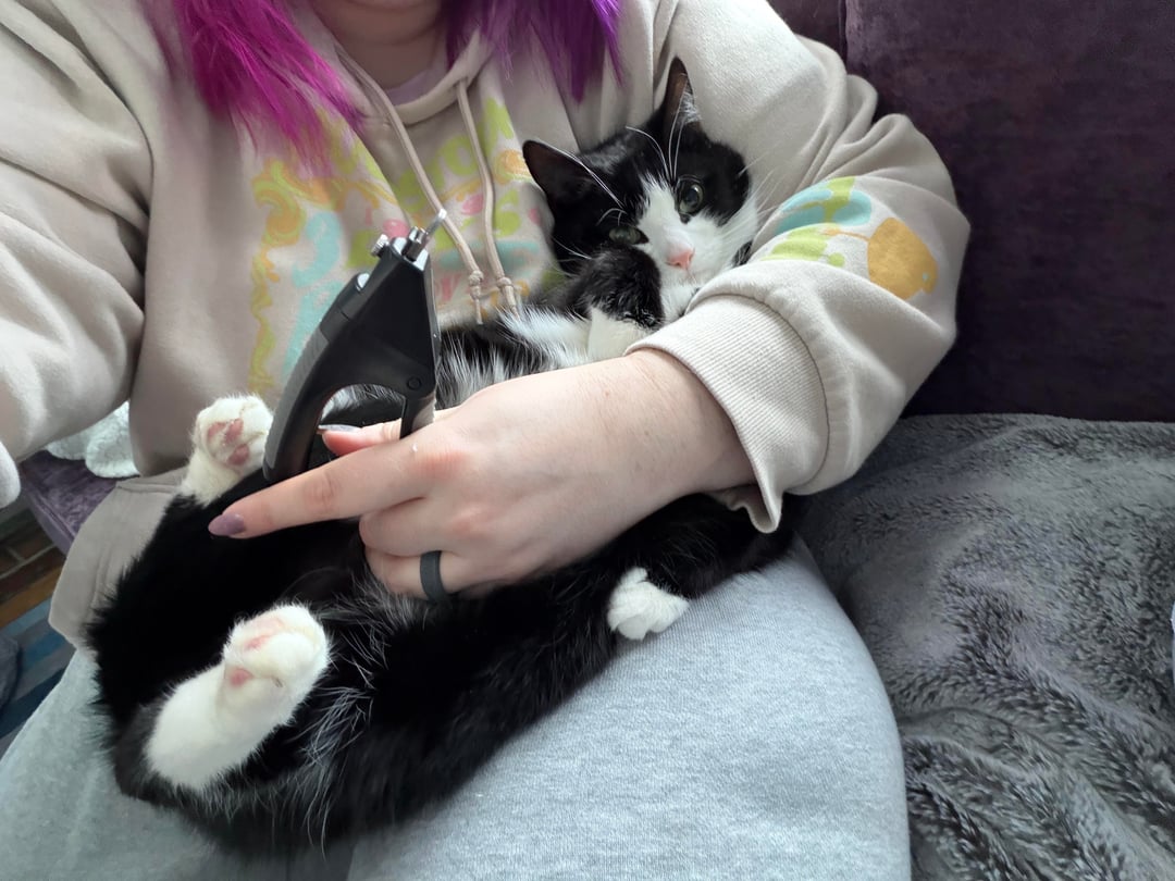 1. my cat has to be burritoed, my husband has to hold her, and then she howls like I’m cutting her fingers off. I only trim the very tip so she doesn’t have razor sharp needles.