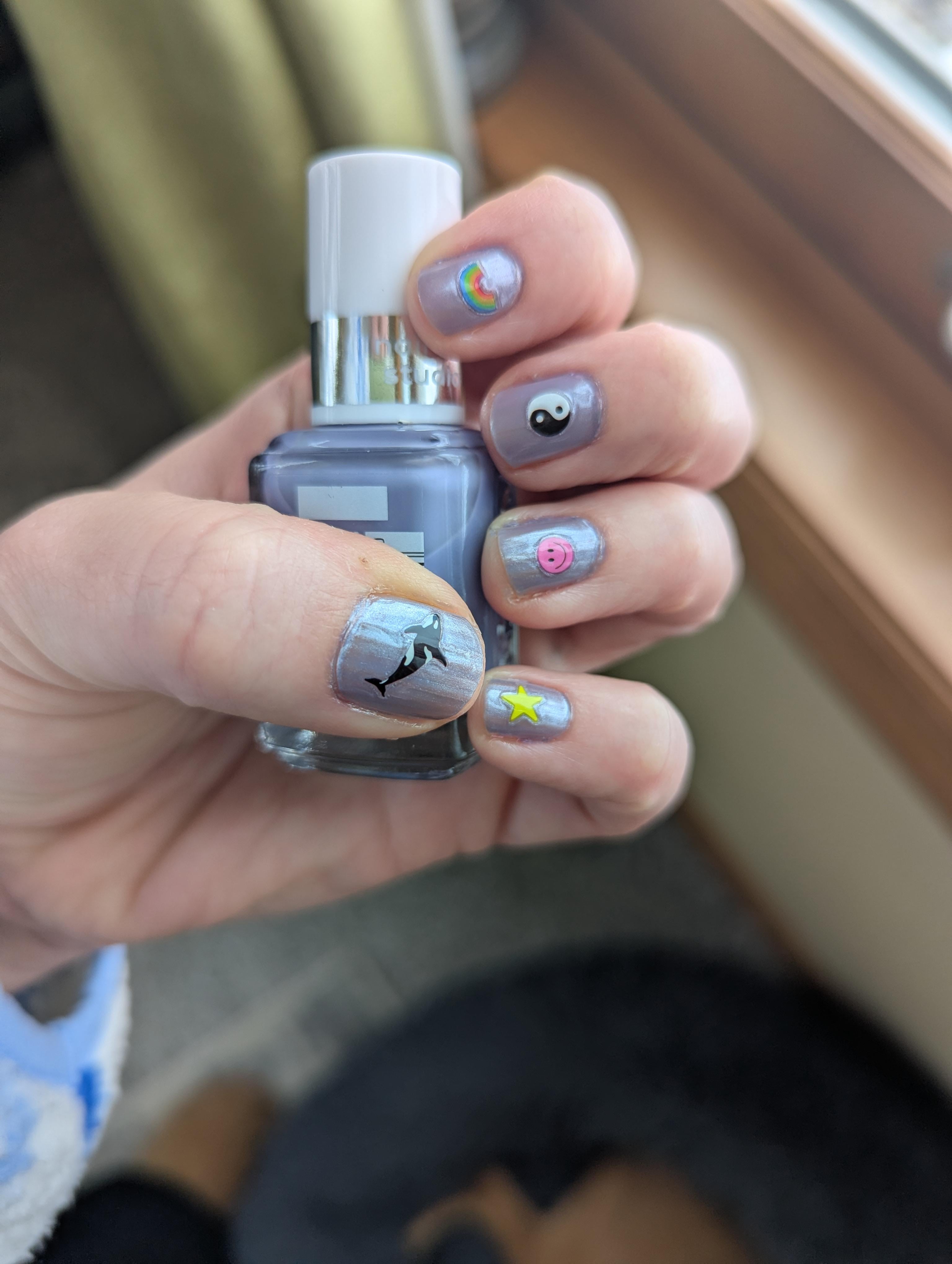 These are Deco Beauty stickers. Nail polishes are Essie Orchid Jelly, Essie Cosmic Chrome on top, and the Essie Gel Couture top coat. by Cheeseaisleinheaven
