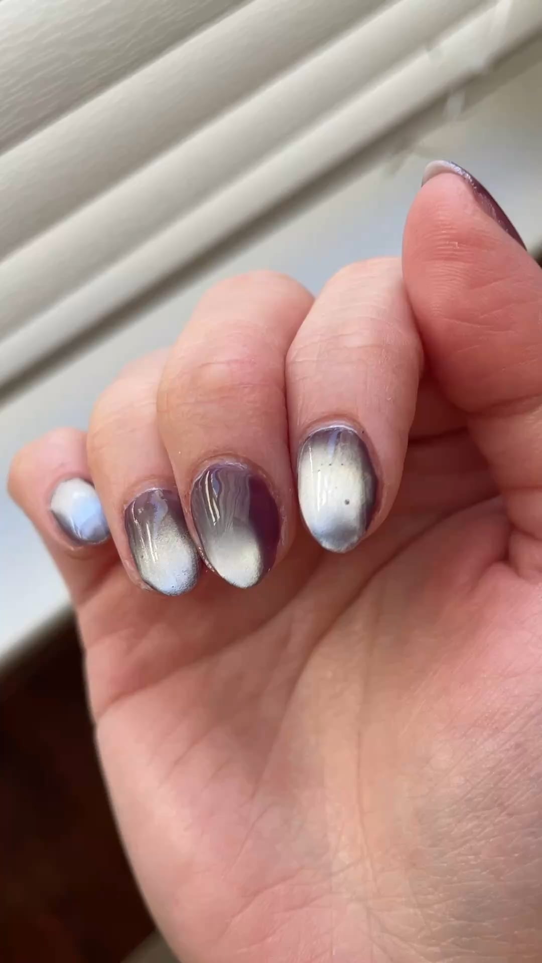 – 2 coats of Beeās Knees Lacquer Choo-Choo, magnetized the second coat with the glass bead tool on all nails but my thumb, which is magnetized with a horseshoe magnet for velvet effect.