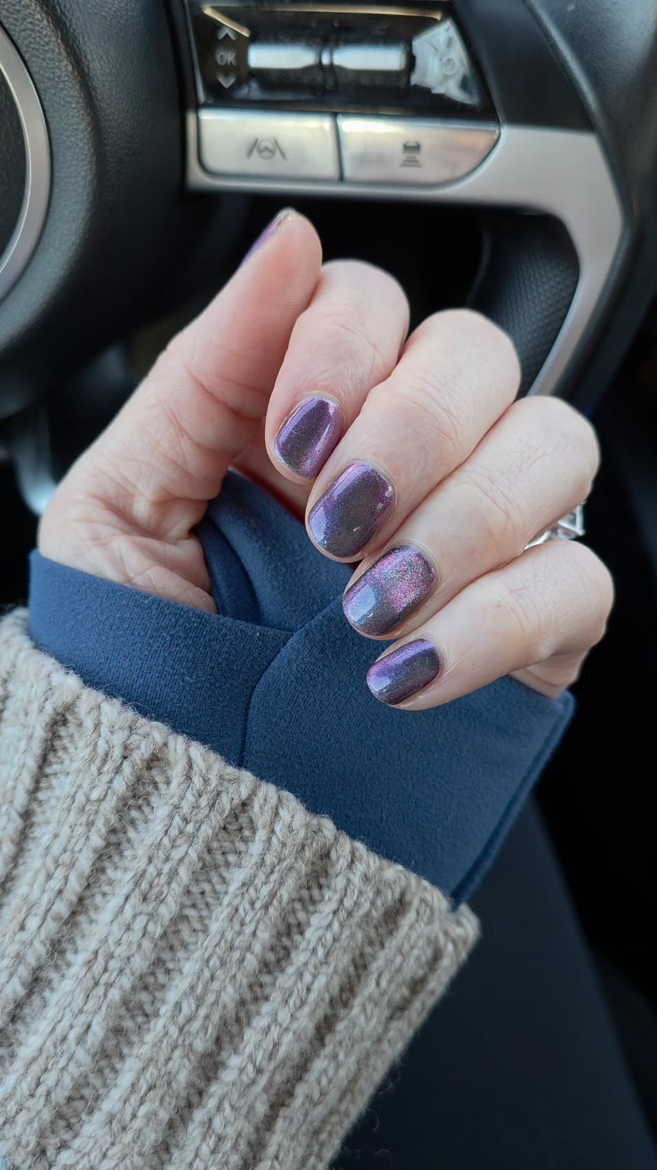 Finally had some time this weekend and threw on this absolute stunner of a shade. This is two coats of Kathleen & co “Wanderlust”. KB Shimmer Fillin Groovy Base and KB Shimmer QD Topcoat Clearly On Top. Magnetized using a lab fish magnetic stirrer for a few seconds for each coat of polish and 1 full minute for topcoat. I also work one hand at a time and completely finish my left hand before starting my right including topcoat.