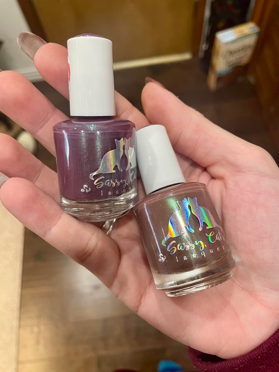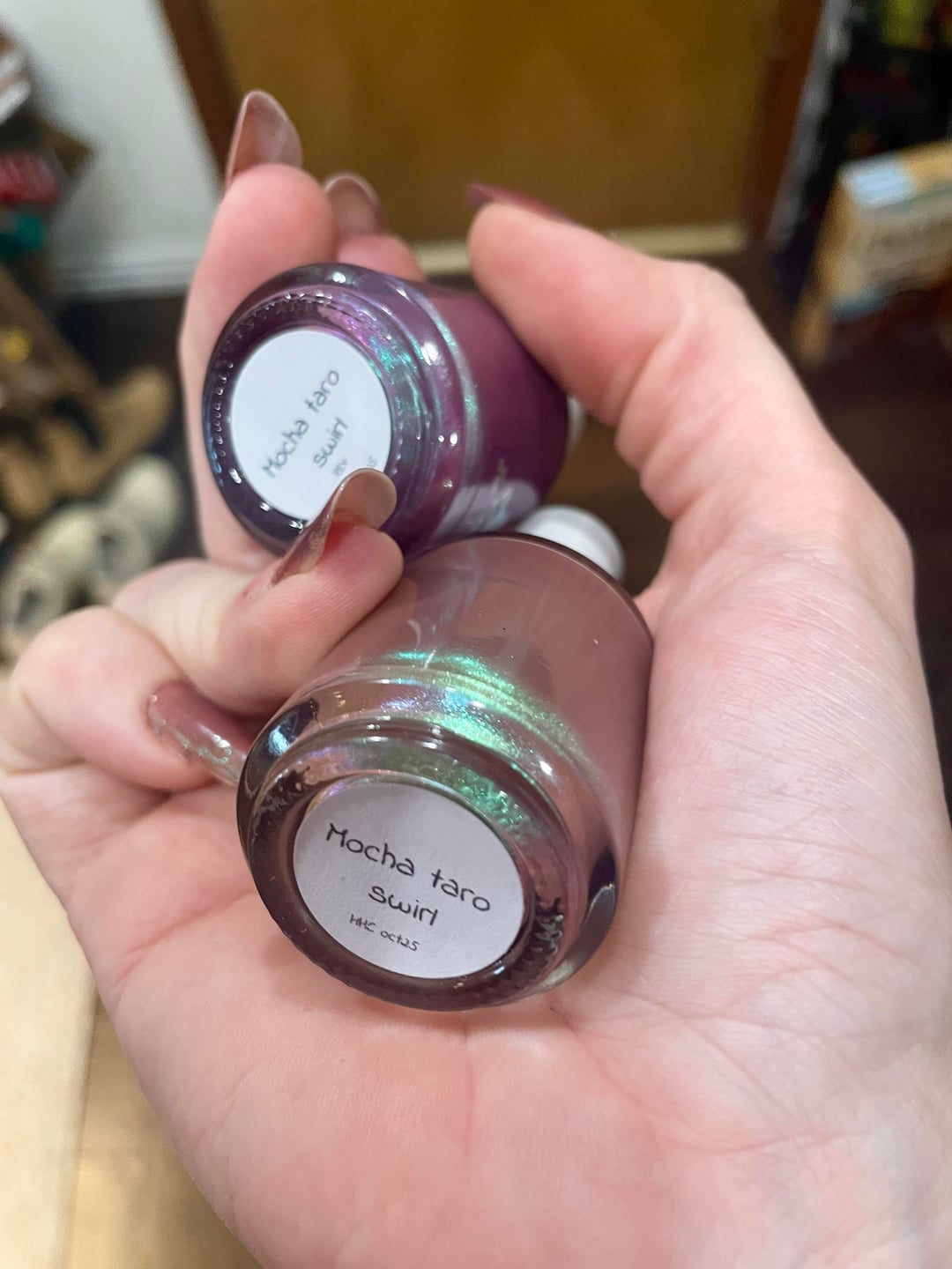 My two versions of Sassy Cats Lacquer’s Mocha Taro Swirl (HHC Oct 25) have been sitting in my helmer since I got the replacement and thought others might get a kick out of just how different the oopsie batch was compared to the OG/intended swatched version.