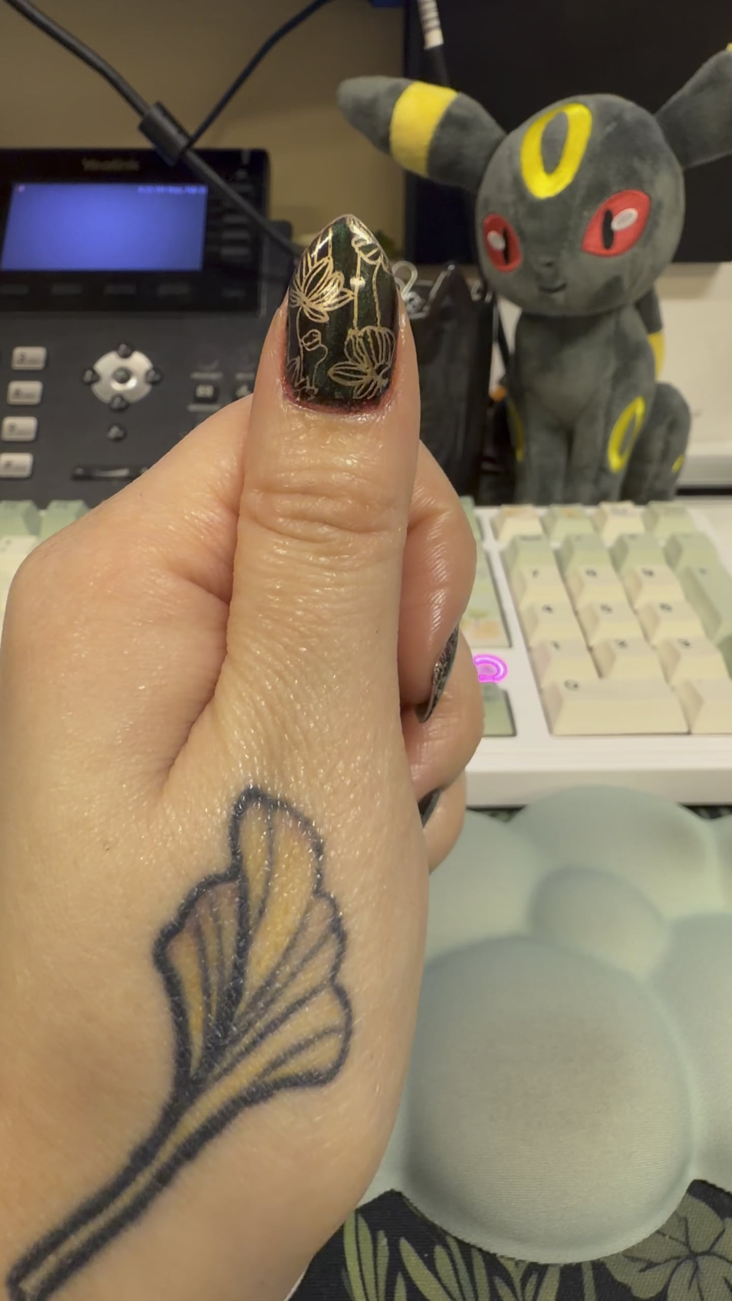 BKL’s Goddess of Spring magnetized in the same various magnetic styles as last week just in reverse. Thumb is a vertical cat eye, index is glass bead, middle is velvet, ring is also glass bead, and pinky is done using the apple watch charger french tip method. All stamped with Sinful Color’s Gold Medal.