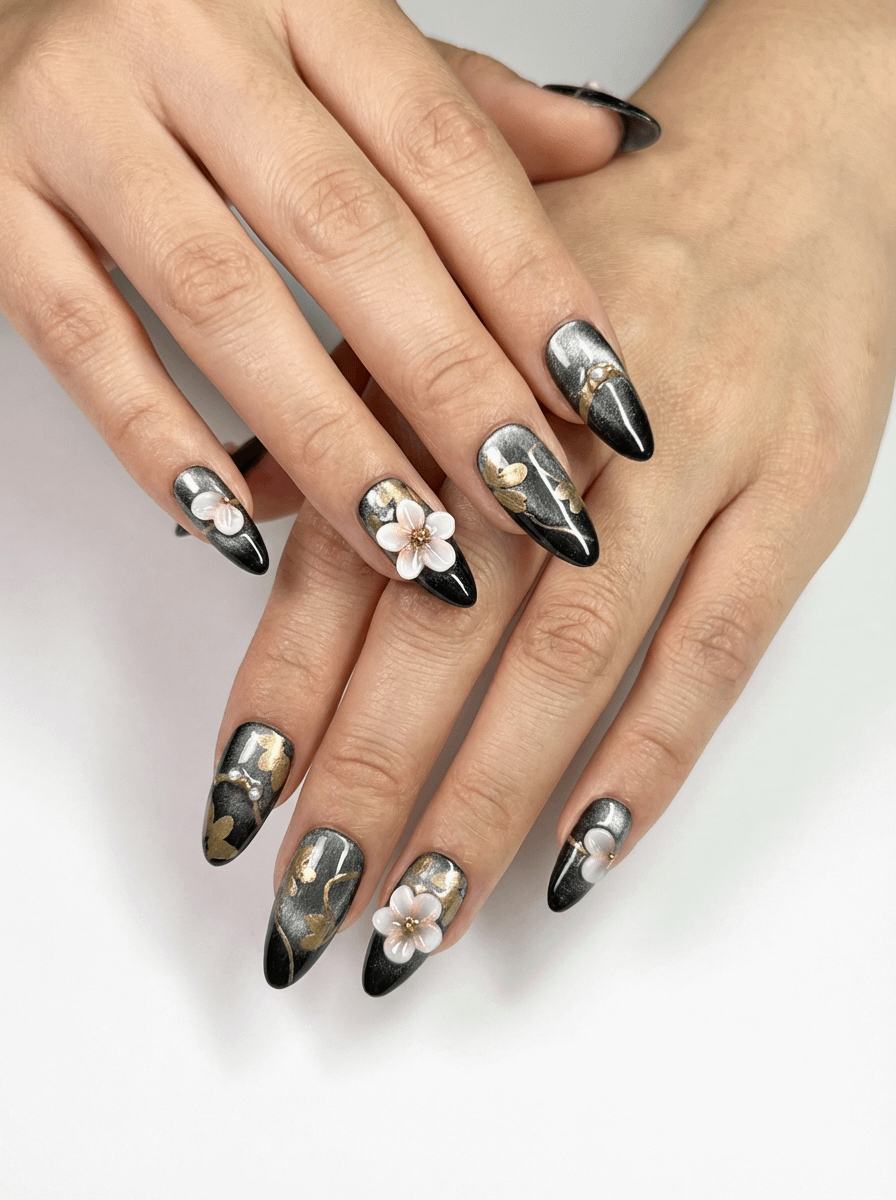 Tried a black chrome look with gold details and soft 3D flowers — love how elegant it turned out. It’s a press-on set I wore this week 💅 by Disastrous_Key3597