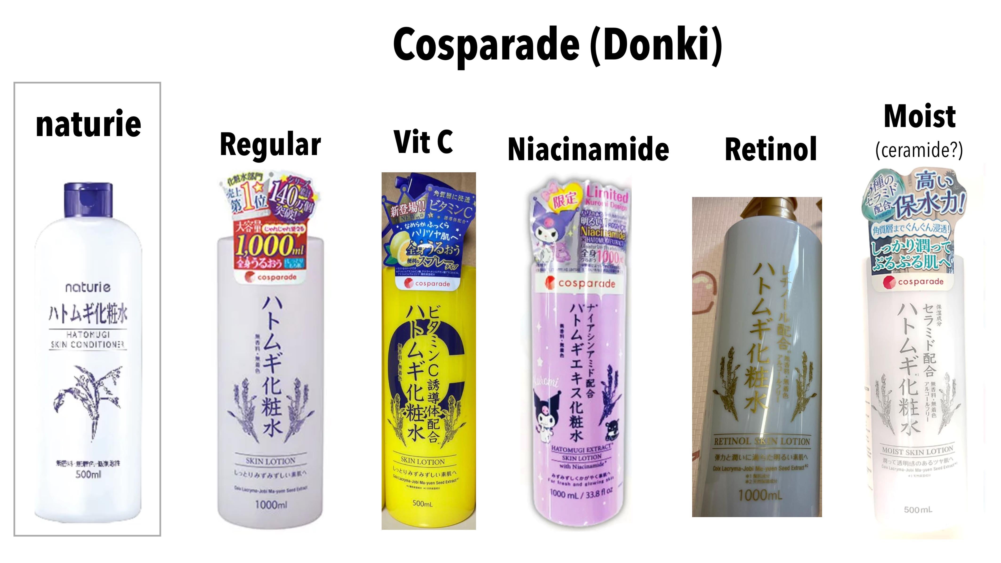 I believe the OG hatomugi lotion/toner product is the one from NATURIE. There are also other dupe brands like Reihaku… Donki, Matsukiyo, and Tsuruha also have their own housebrand dupes. The ones depicted in the attached image are the various versions I’ve seen Donki (DonQuijote) put out. Personally I’ve only tried the ‘regular’ version and believe it’s a decent dupe. I’ve seen the yellow and lilac bottles in stores but not interested. (allergic to niacinamide. don’t like yellow). I first saw the retinol floating in images online maybe around autumn 2025 and the moist one in Nov2025. I’m interested in both but these two aren’t yet available in my country’s Donki. If you’ve tried any of the donki (housebrand: cosparade) dupes, what are your thoughts?