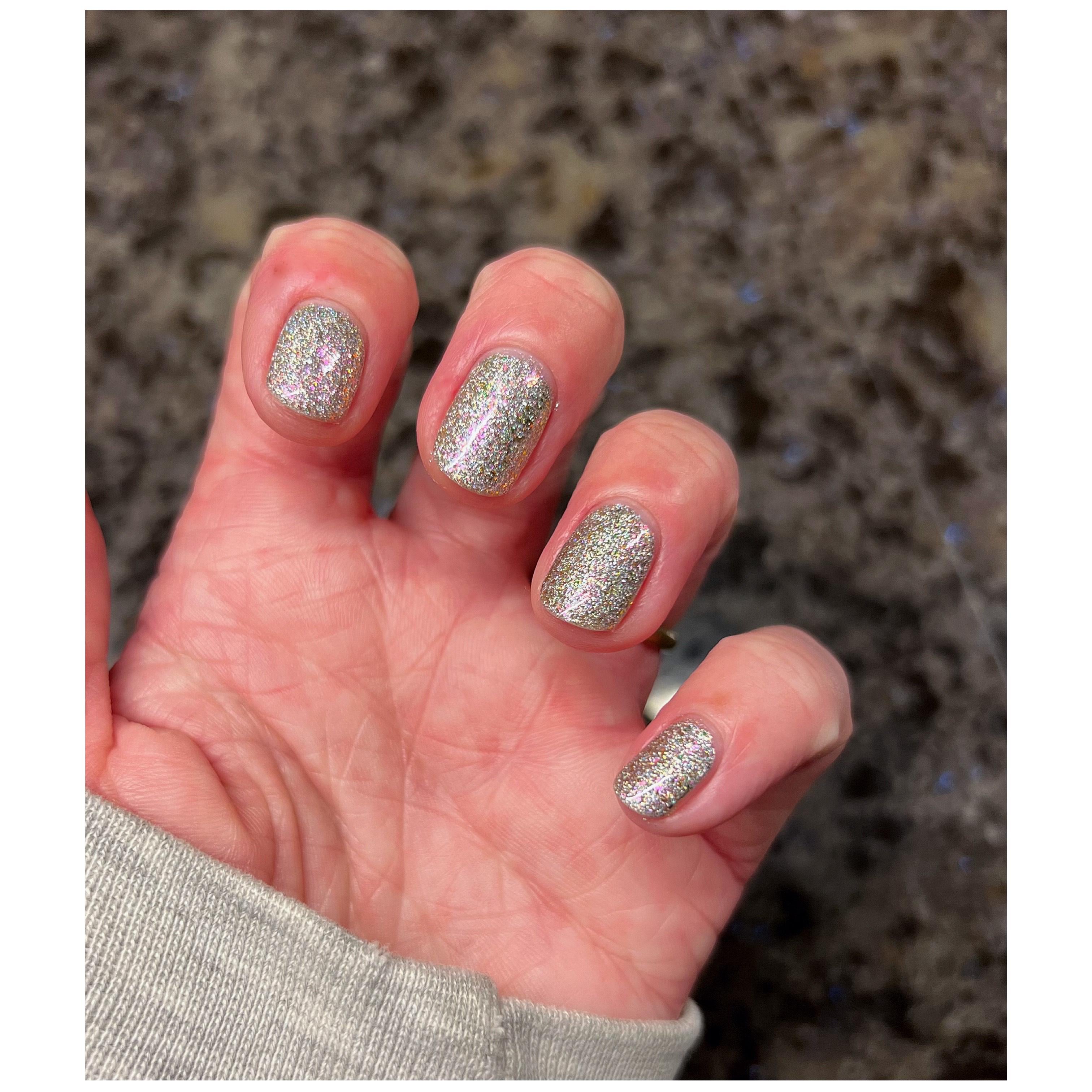 I tend not to gravitate towards really chunky, glitter-y polishes but wanted to get a charity polish and thought this one was really interesting. I actually really love it. The magenta flecks are just, so cool. RIP Renee.