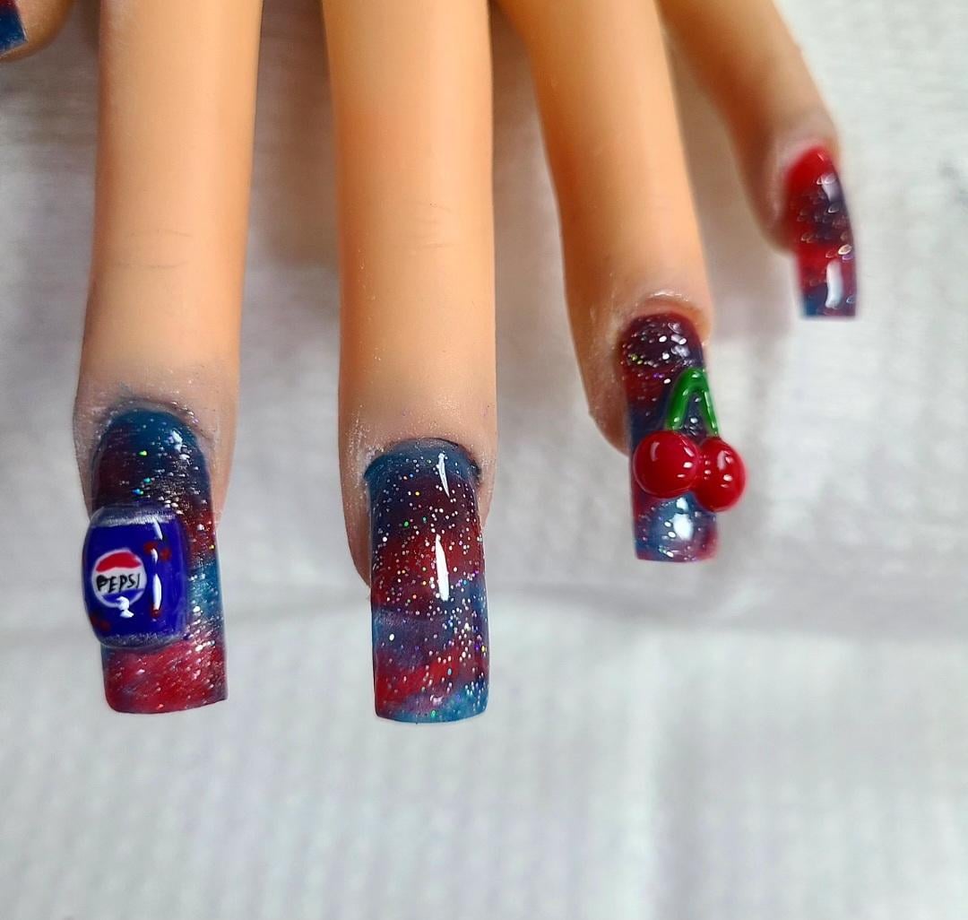 We were doing acrylic marble in school today and I did these red and blue cherry pepsi nails by gaylizardjuice