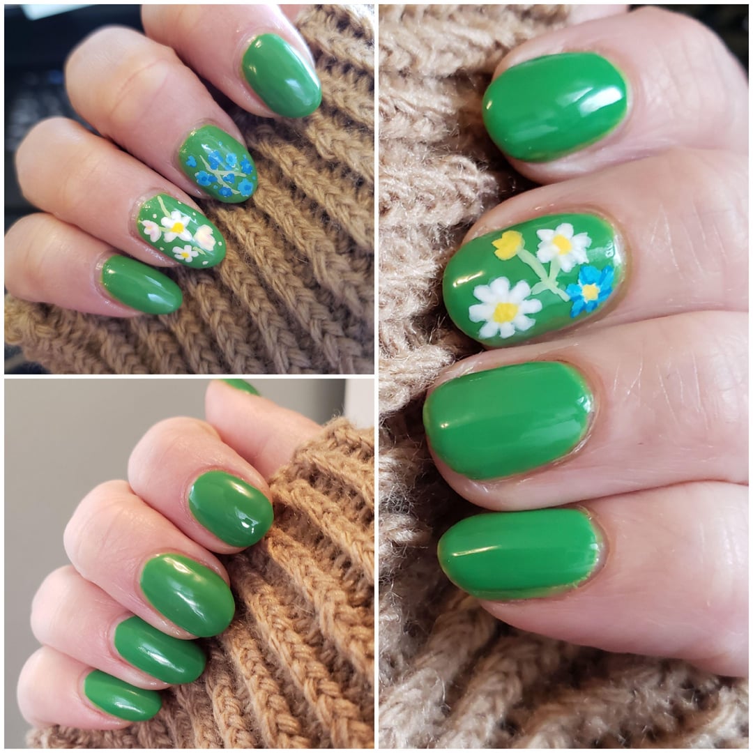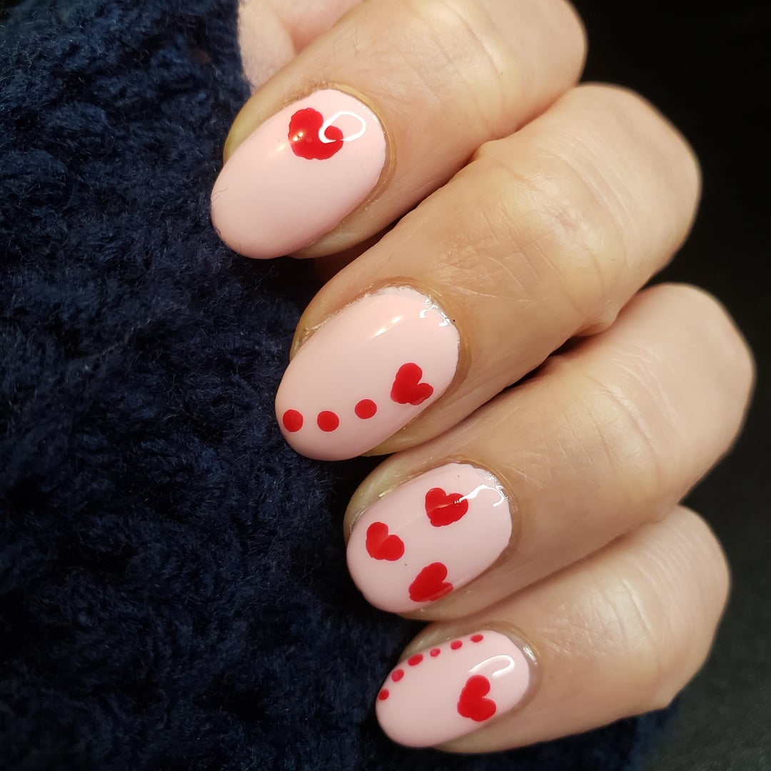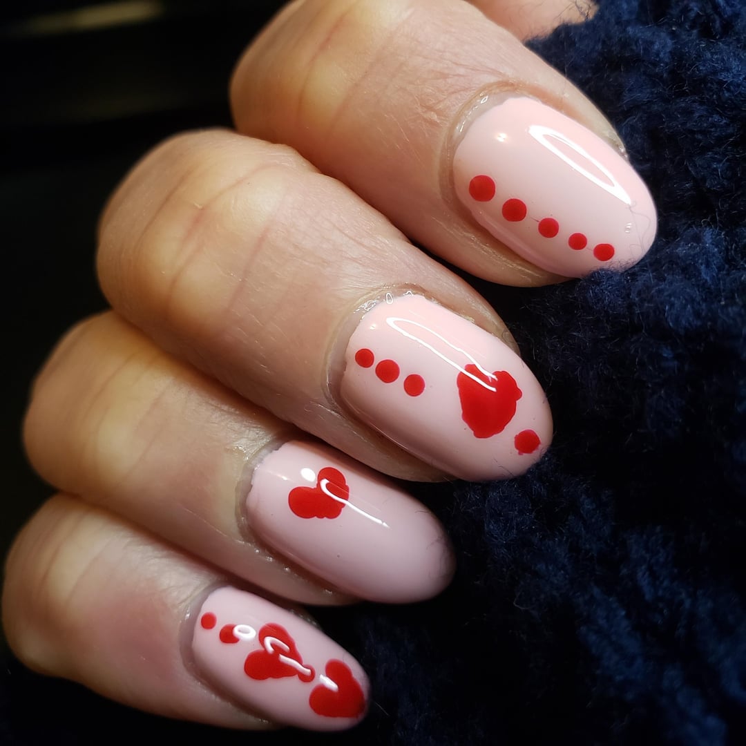 Did the hearts with a dotting tool, it’s harder than it looks! The ones I did with my non dominant hand are hilariously blobby. The orly polish was a Christmas present and I haven’t worn it alone yet. After trying it for this it’s too sheer for small art I should’ve used a good solid creme.