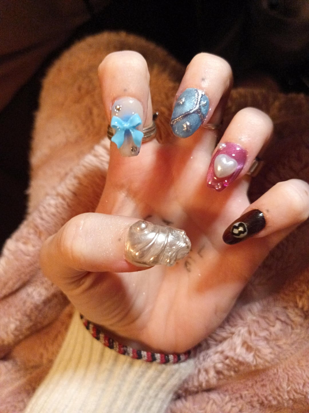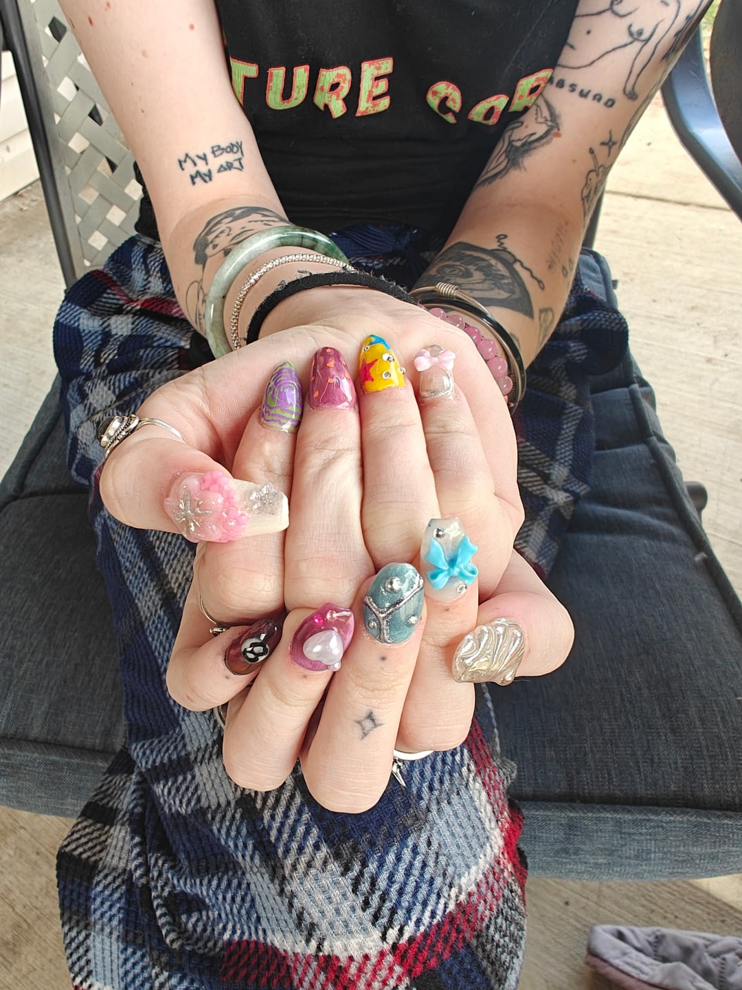I spent all day doing my nails yesterday, I recently bought a gel x kit and non sticky builder gel. I just wanted to have fun and be kooky lol, my left hand is short round and coffin and my right hand is medium coffin and stiletto because I wanted to try my favorite shapes and lengths.