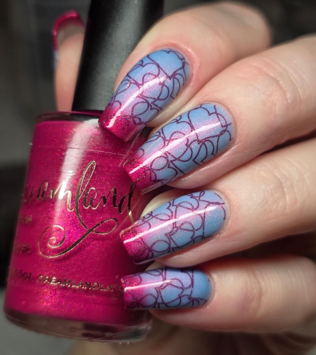 Valentines manicure!!! Base Dream Land Lacquer Bedazzled (thermal) Jan 2026 Polish Pickup exclusive stamped with Holo Taco Dead Petals, stamping plate Uber chic beauty Love & marriage plate 03