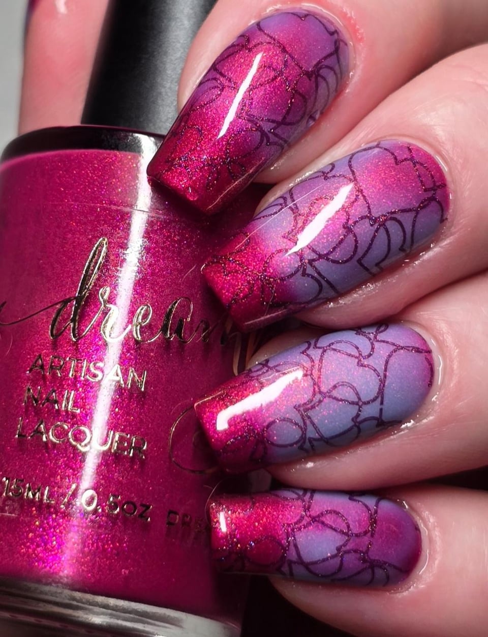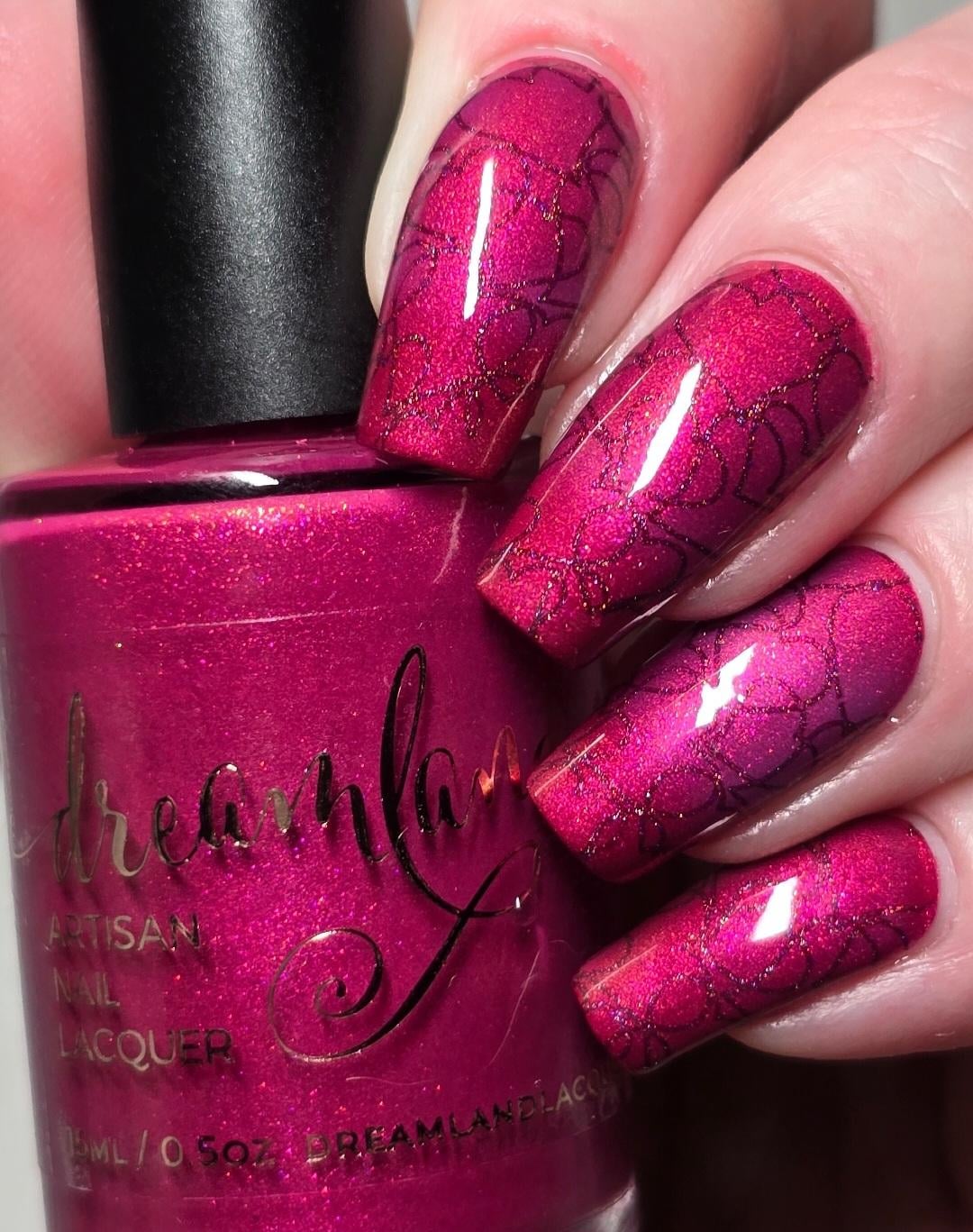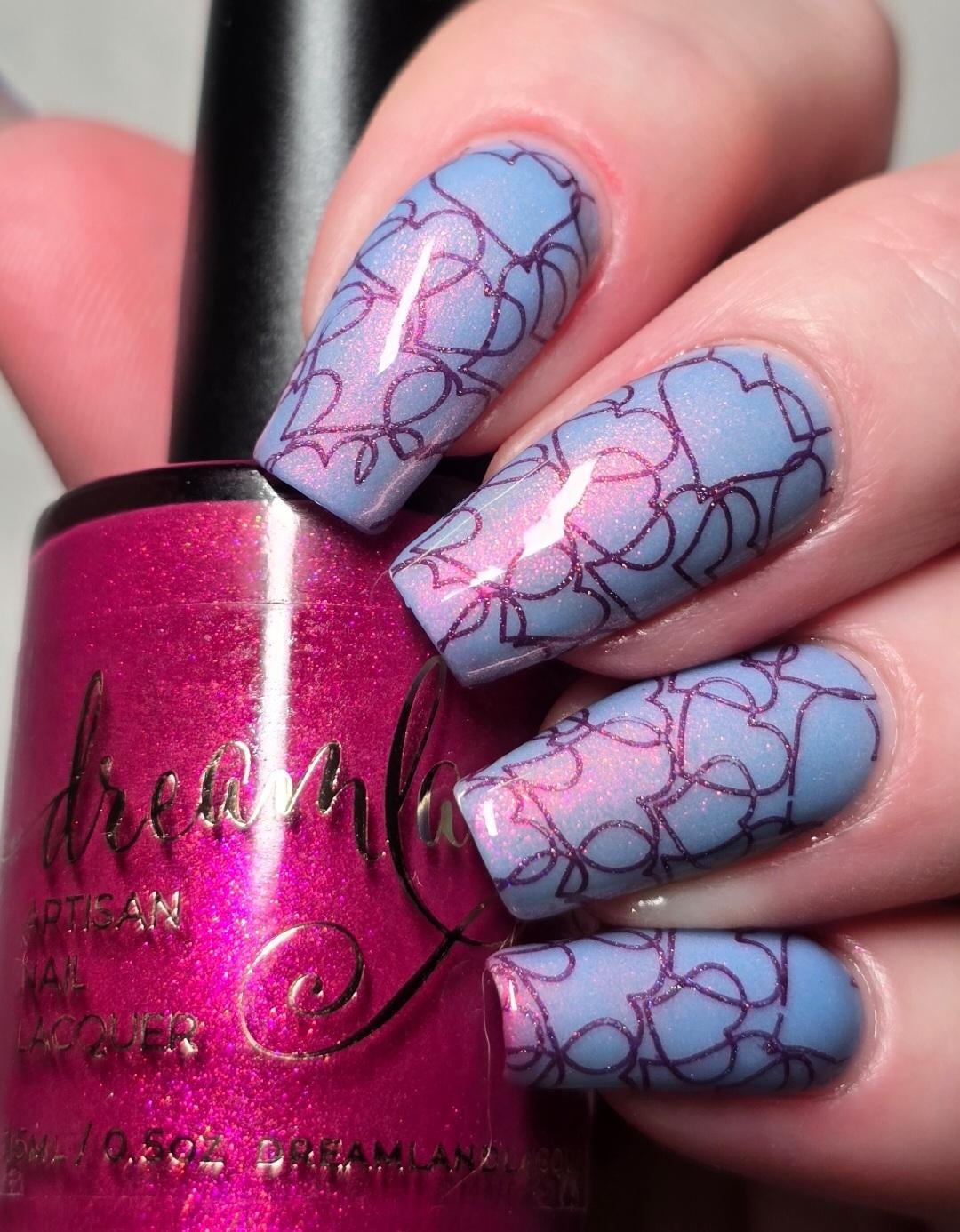 Valentines manicure!!! Base Dream Land Lacquer Bedazzled (thermal) Jan 2026 Polish Pickup exclusive stamped with Holo Taco Dead Petals, stamping plate Uber chic beauty Love & marriage plate 03