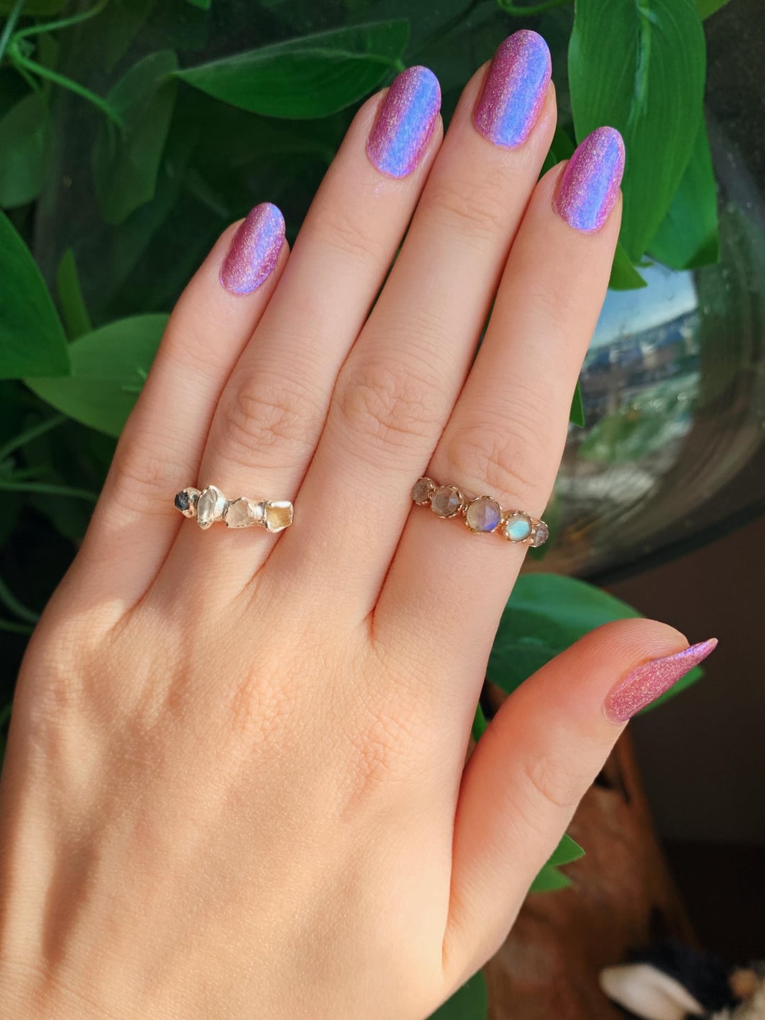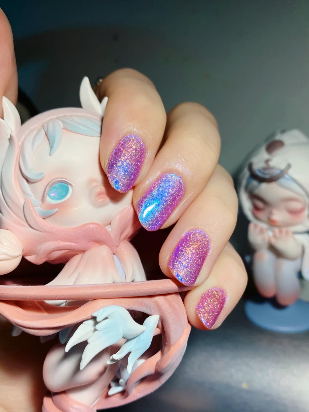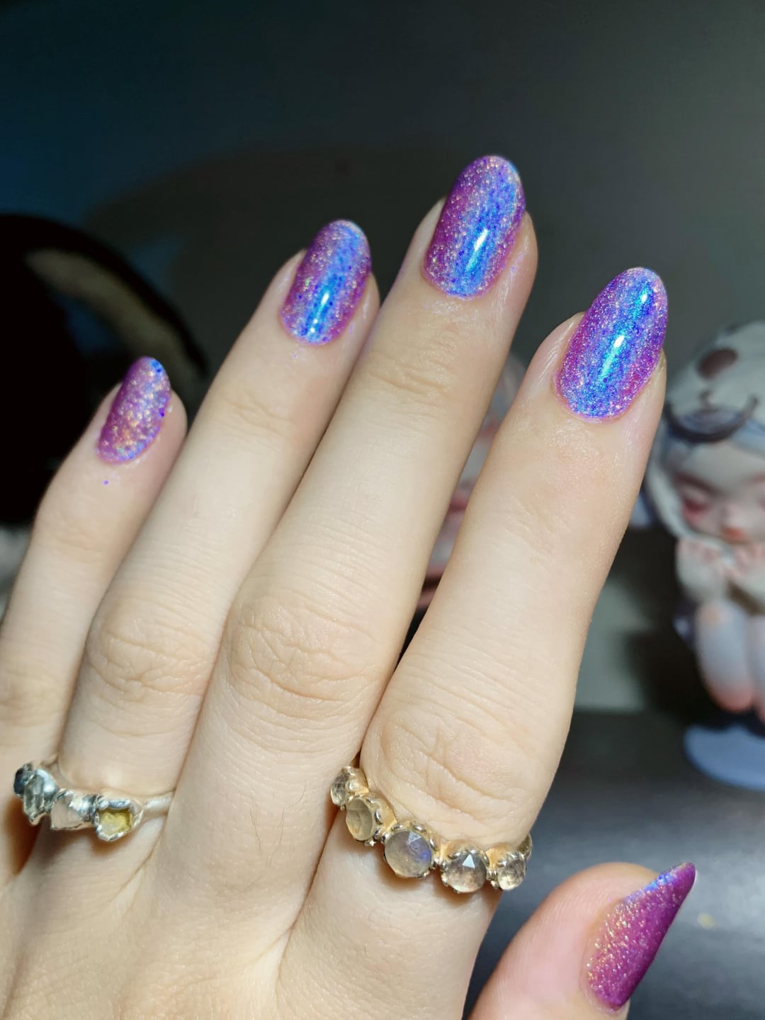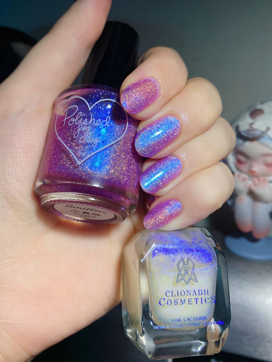 Smitten tickles that ILNP Flower Child itch as I’m almost out, but with a ton of dreamy glitter and maybeee a stronger blue glow? But I also amped up the blue with a coat of UV, so the polish is HELLA blue under certain lights and at angles. LOVE.