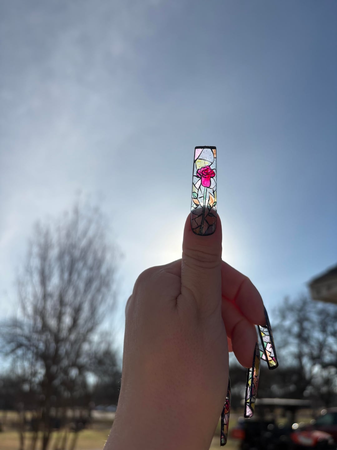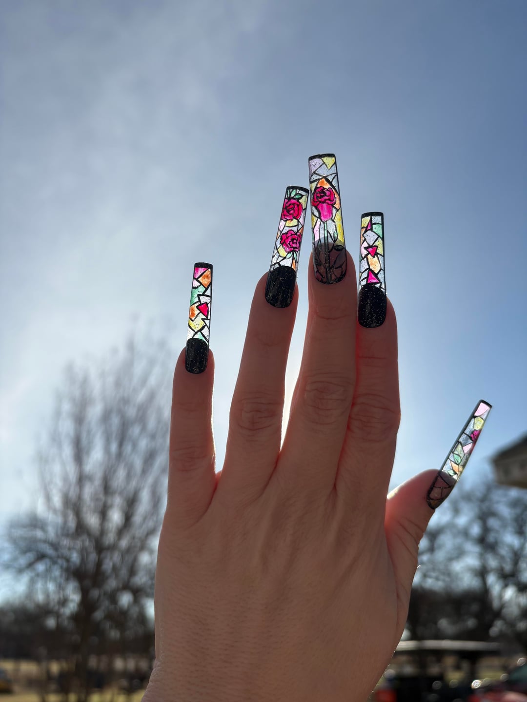 I tried both iterations: black filled in and extending design to the base of the nail. Also added a layer of Holo Taco’s Holo Taco.