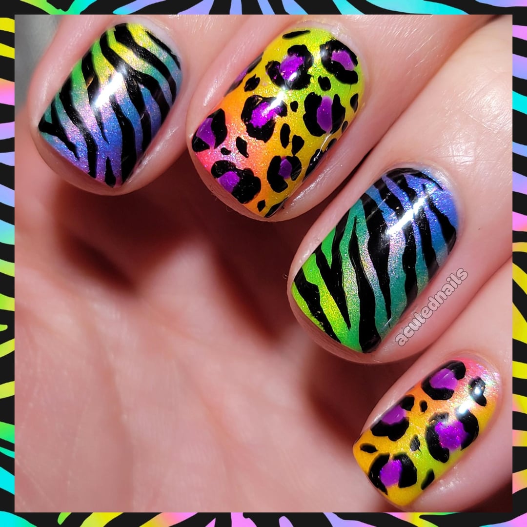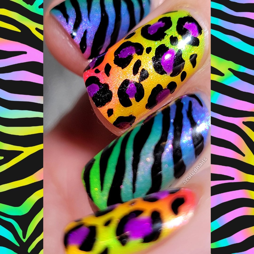 This mani was for celebrating a friend on Instagram and of course I fell right into this Lisa Frank extravaganza. I got to whip out Prisms fun Mallrat collection from the summer, because we all need some NEON in our lives still. I played around with lazy gradienting them together on the nail, which was actually quite easy with this formula. Toss some animal print on top and its disgustingly delicious. I'm quite proud of myself that now at this point, even with like 8 different animal print plates, its easier and faster for me to Freehand it now 🙌💅 cmon upgraded skills!