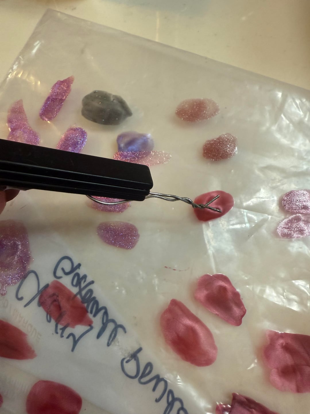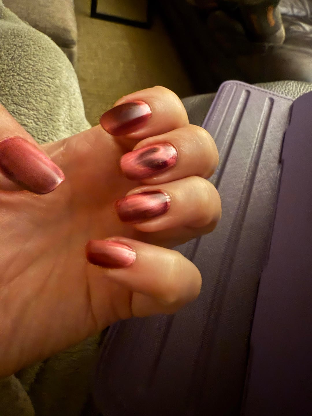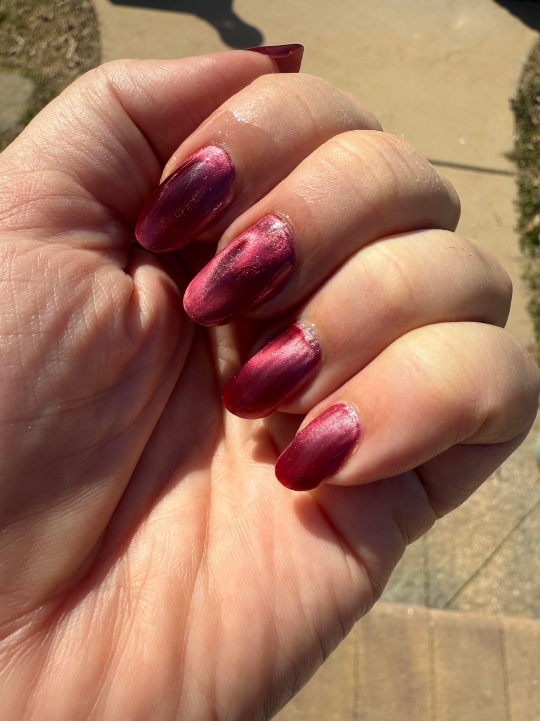I tried the same thing the other night! I tried with BKL choo choo which worked pretty well but Kathleen and co molten sky didn’t do anything. I think the fine particles must show the design better. I sandwiched a paper clip between a metal gift box lid and the neodymium magnet so that I didn’t have to hold it. I angled the paperclip so it would hover above my finger.