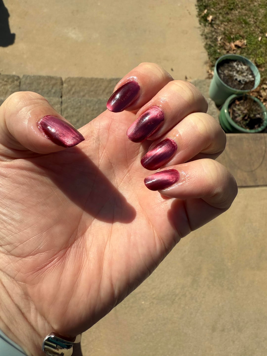 I used the dot magnet (pointer fingie), bar (cat eye: ring, pinky), and velvet (thumb). Sunny photo was after 12 hours. Video added to comments.