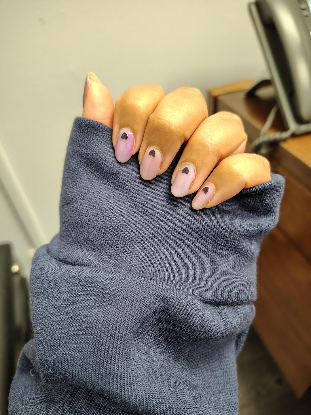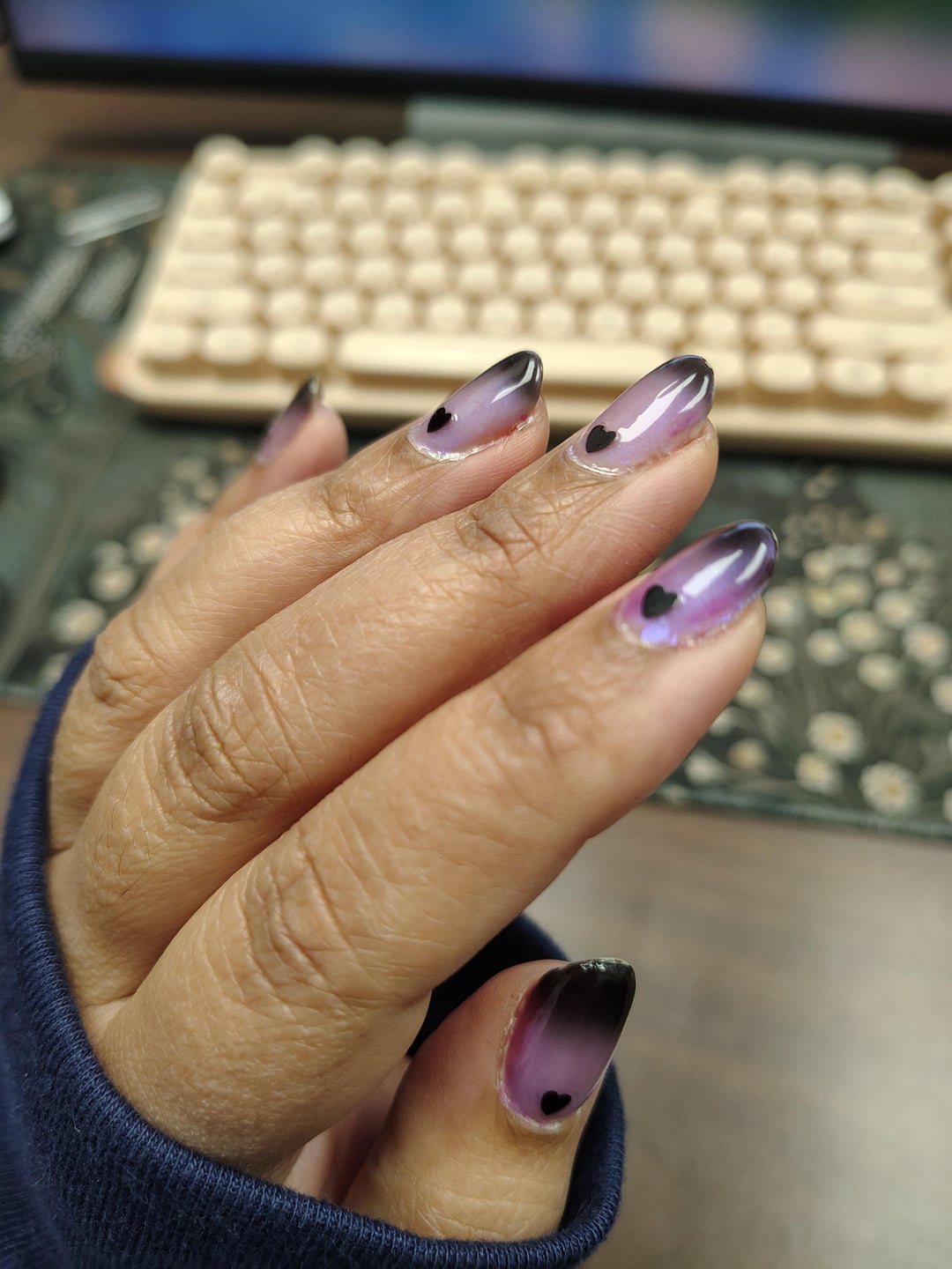 First picture is the transition state I guess you could call it, and second picture is in warm state. Used kbs ridge filler base coat, sassy sauce shimmy shake, Fancy gloss black thermal top coat, and some heart glitter from Amazon, topped with Sally Hansen insta dry top coat.