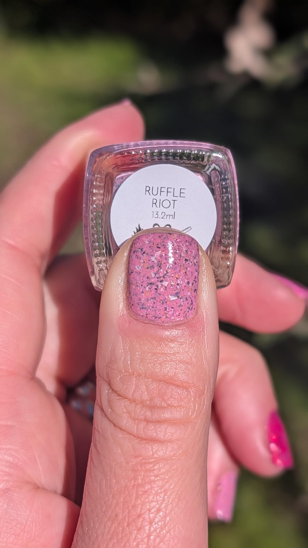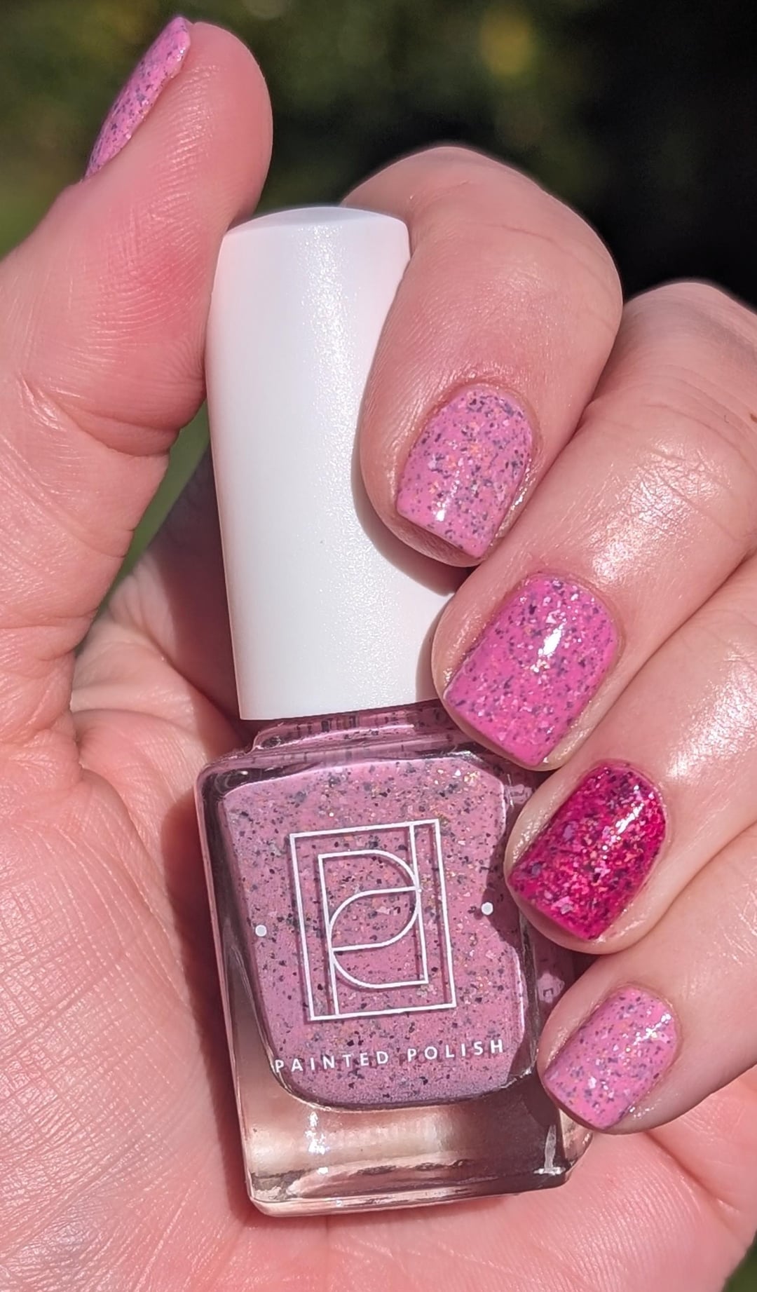 Painted Polish Ruffle Riot – thumb, index, pinky. Painted Polish Bubblegum Brawl – middle. Painted Polish Rosy Rebellion – ring. Two coats of each with Glisten & Glow top coat.