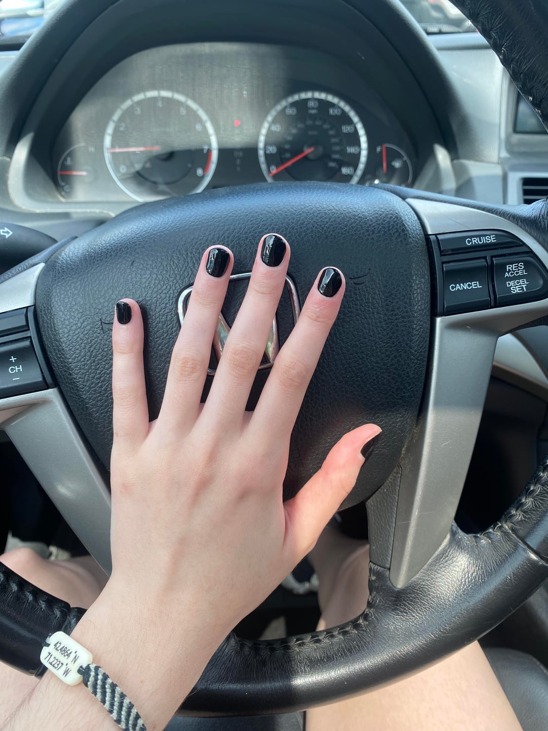 1 and 2 are fine, 3 is an abomination. If you are worried about creepiness choose any color other than crypt black lol. Almond shape looks good on your hands, if you absolutely must have a dark color go with something subtler and warmer. A dark maroon, deep purple, burgundy, even mahogany.