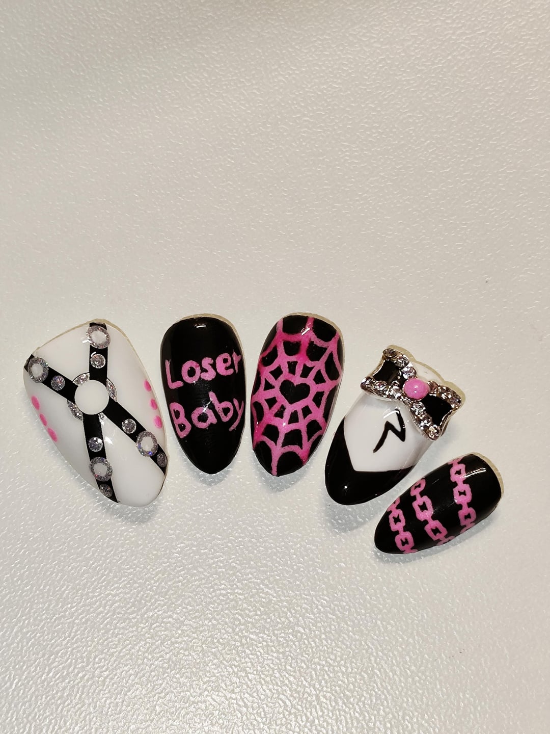 If anyone of you guys are familiar with Hazbin Hotel, (available on prime video), you may know who inspired this set. It's inspired by the character Angel Dust. I love the show and I'm planning on doing sets also for other characters. I'm also not a professional nail tech, just doing this as a hobby and this is my first set I've ever done. But I am super happy with it to be honest 🙂